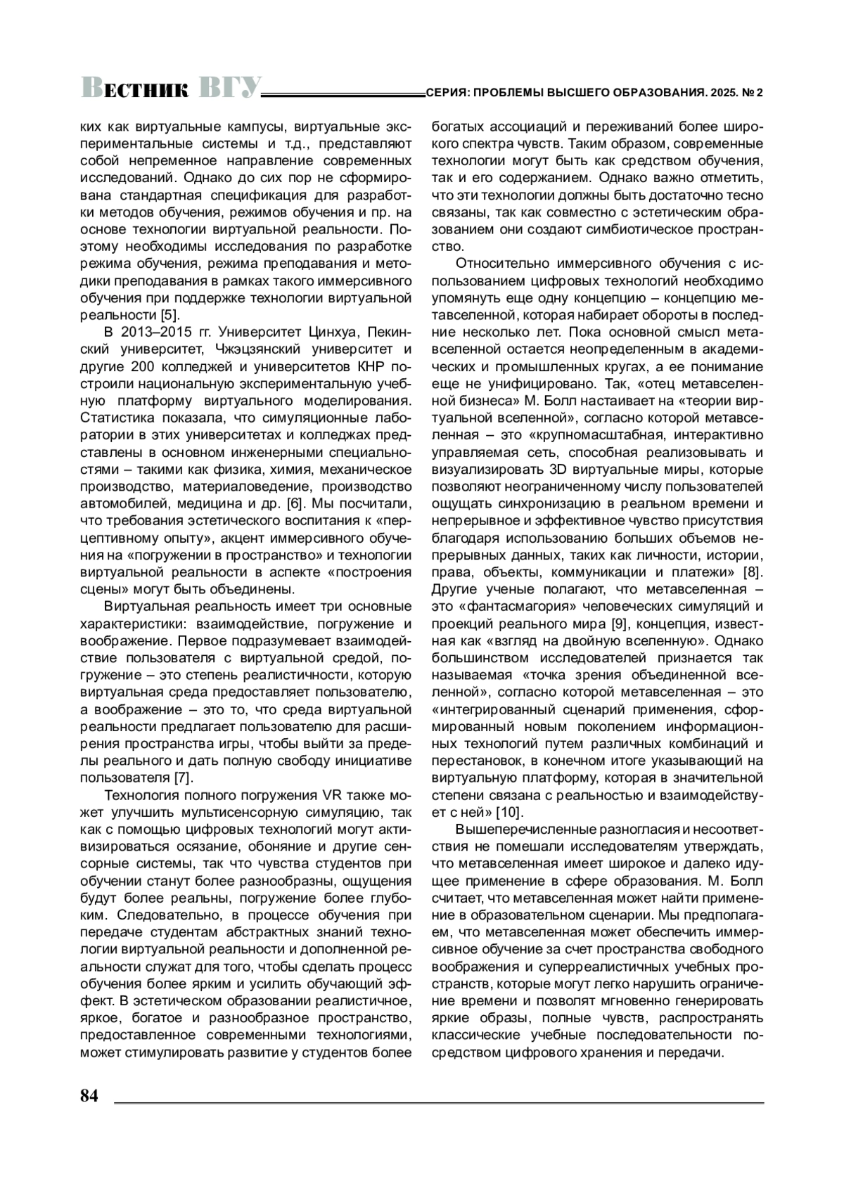 6. 周屹. 全沉浸式VR技术在高校艺术设计专业实验教学的改革与实践 // 高教学刊. - 2020. - № 24. -C. 139-146. [Чжоу И. Реформа и практика использования технологии полного погружения в виртуальную реальность в экспериментальном преподавании искусства и дизайна в колледжах и университетах /И. Чжоу // Журнал высшего образования. - 2020. -№ 24. - C. 139-146.].