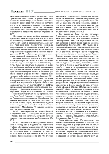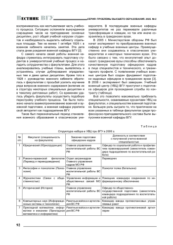 Сегодня ВГУ является единственным гражданским вузом России, где ведется подготовка кадровых офицеров в интересах Департамента информации и массовых коммуникаций Министерства обороны РФ по специальности «Военная журналистика». В ее реализации на равных правах участвуют факультет журналистики и ВУЦ, опираясь на ранее накопленный опыт сотрудничества. И это уже не просто взаимодействие военной и вузовской подготовки, а единое целое. На факультете философии и психологии на базе специальности «Психология служебной деятельности» в ВУЦ готовят офицеров по учетновоенной специальности «Военная психология» в интересах Департамента психологической работы Министерства обороны РФ.