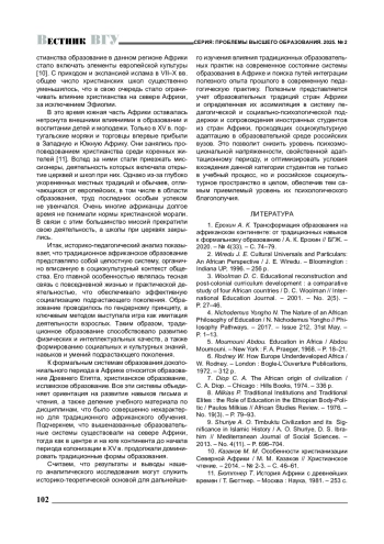 1. Ерохин А. К. Трансформация образования на африканском континенте: от традиционных навыков к формальному образованию / А. К. Ерохин // БГЖ. -2020. - № 4(33). - С. 74-79.