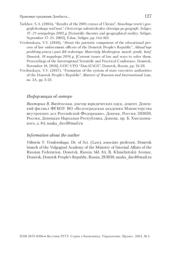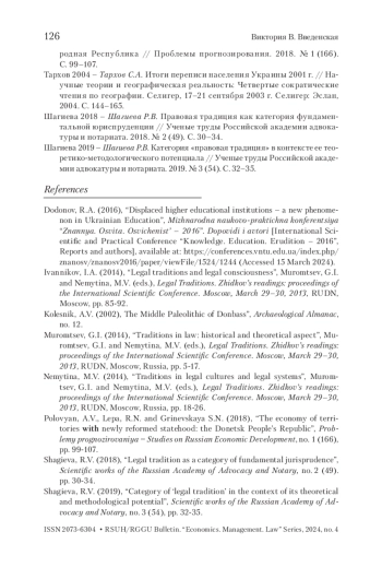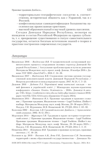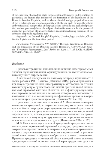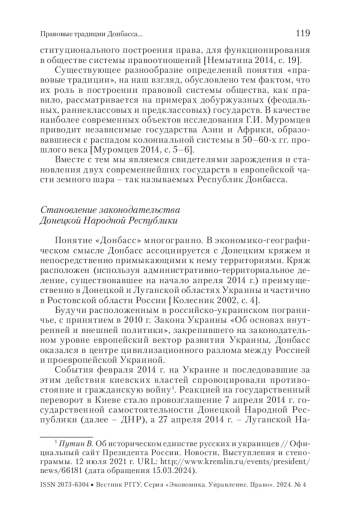 ВВЕДЕНСКАЯ В. В. ПРАВОВЫЕ ТРАДИЦИИ ДОНБАССА И ЗАКОНОДАТЕЛЬСТВО ДОНЕЦКОЙ НАРОДНОЙ РЕСПУБЛИКИ // ВЕСТНИК РГГУ. СЕРИЯ: ЭКОНОМИКА. УПРАВЛЕНИЕ. ПРАВО. 2024. № 4