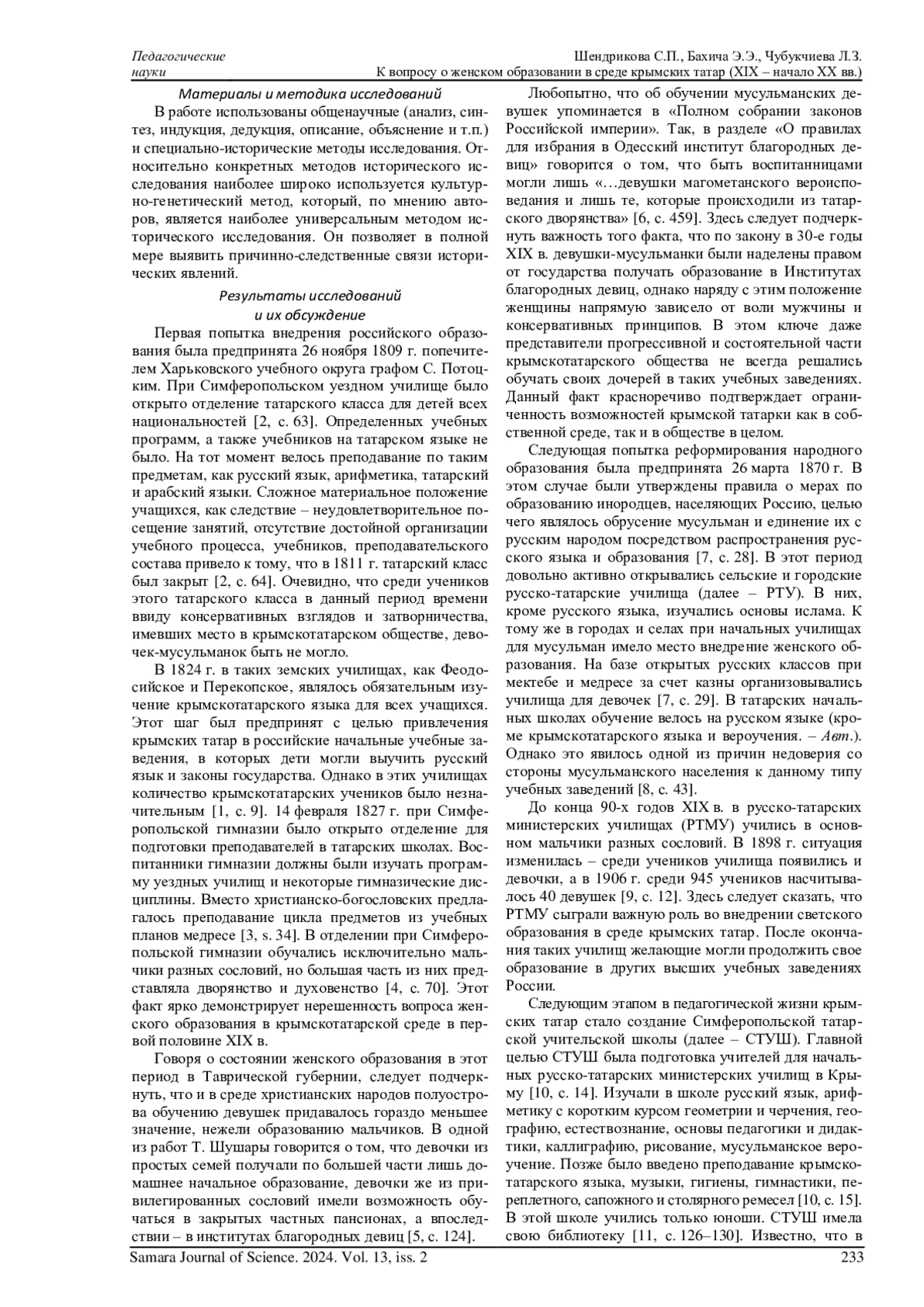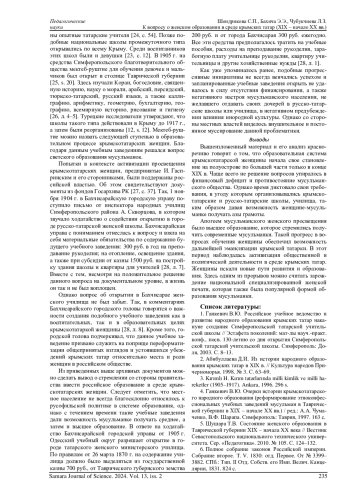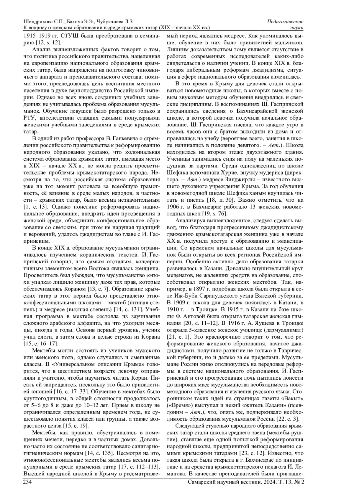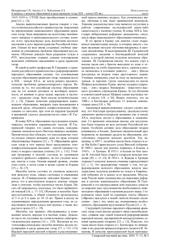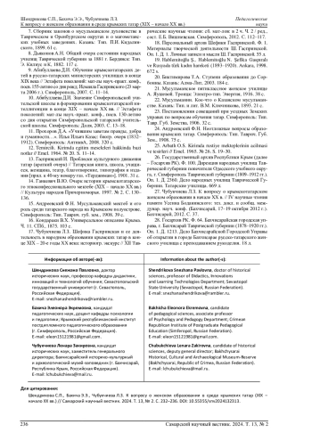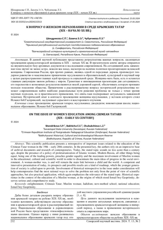 ШЕНДРИКОВА С. П., БАХИЧА Э. Э., ЧУБУКЧИЕВА Л. З. К ВОПРОСУ О ЖЕНСКОМ ОБРАЗОВАНИИ В СРЕДЕ КРЫМСКИХ ТАТАР (XIX - НАЧАЛО XX ВВ.) // САМАРСКИЙ НАУЧНЫЙ ВЕСТНИК. 2024. ТОМ 13, № 2