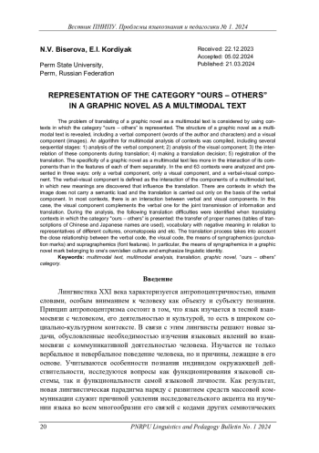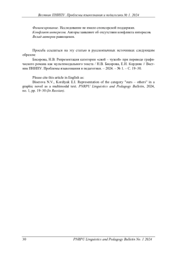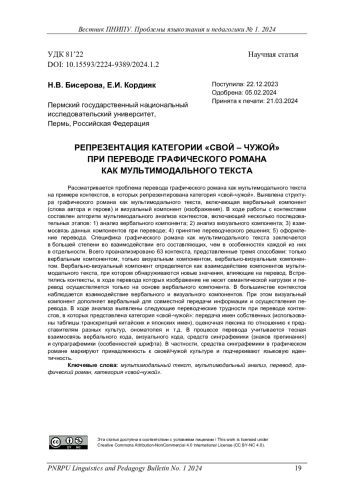 БИСЕРОВА Н. В., КОРДИЯК Е. И. РЕПРЕЗЕНТАЦИЯ КАТЕГОРИИ "СВОЙ - ЧУЖОЙ" ПРИ ПЕРЕВОДЕ ГРАФИЧЕСКОГО РОМАНА КАК МУЛЬТИМОДАЛЬНОГО ТЕКСТА // ВЕСТНИК ПЕРМСКОГО НАЦИОНАЛЬНОГО ИССЛЕДОВАТЕЛЬСКОГО ПОЛИТЕХНИЧЕСКОГО УНИВЕРСИТЕТА. ПРОБЛЕМЫ ЯЗЫКОЗНАНИЯ И ПЕДАГОГИКИ. 2024. № 1