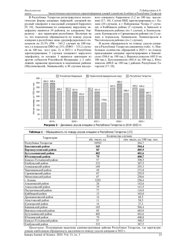 9. Губейдуллина А.Х. Эколого-эпидемиологическая ситуация по клещевому энцефалиту и иксодовому клещевому боррелиозу в Республике Татарстан в период с 2017 по 2021 годы // Самарский научный вестник. 2022. Т. 11, № 4. С. 18-21. DOI: 10.55355/snv2022114102 EDN: FYHEDK
