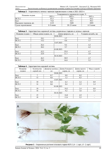 В интенсификации отрасли садоводства главная роль отводится клоновым слаборослым подвоям. Зеленое черенкование является основным методом размножения клоновых подвоев косточковых культур. Основой технологии зеленого черенкования является биологическая способность растений к регенерации. Технология укоренения зеленых черенков основывается на выращивании целых растений из облиственных стеблевых черенков за счет формирования новых придаточных корней. Исследования проводились в ГБУ СО НИИ «Жигулёвские сады» в период с 2021 по 2023 годы. Зеленые черенки подвойных форм высаживали в теплице площадью 18 м², с покрытием из сотового поликарбоната. Микроклимат в теплице поддерживался с помощью ультразвуковой туманообразующей установки, работающей ежедневно с 07:00 до 20:00. Объектом исследования были 10 клоновых подвойных форм для вишни и черешни, включая ВСЛ-2 [Вишня БС-2 ( P. frutikosa Pall.) × Л-2 ( P. lannesiana Wils.)], ЛЦ-52 (Любская × Церападус № 1), ЦШ-32 (Церападус № 1 × Ширпотреб черная), группы подвоев Логри (Вишне-черешня Калитвянка × Китайская черешня Карликовая ( P. pseudocerasus ) под следующими номерами: 61-72, 61-701, 61-70, 61-12, 61-740, 61-16, 61-718; 5 подвойных форм для сливы и абрикоса - Бест, Бест-2 (Микровишня низкая × Алыча ( M. besseyi × P. cerasifera ), ВВА-1 (Микровишня войлочная ( P. tomentosa Thunb.) × Алыча ( P. cerasifera Ehrh.), ВПК-1 [(Микровишня низкая × Слива карзинская ( M. besseyi × ( P. nigra × P. americana )] и Эврика 99 [Вишнеслива Сапа ( P. pumila L. × P. salicina Lindl) × алыча Отличница ( P. cerasifera Ehrh.)]. Для повышения процента укореняемости черенки предварительно обрабатывали стимуляторами корнеобразования. Черенки замачивали в водном растворе Корневина (0,6 г/л) или Гетероауксина (100 мг/л) на 16-18 часов перед посадкой для повышения укореняемости. Укоренение зеленых черенков клоновых подвоев плодовых культур осуществляли в теплице при температуре воздуха +30…+35°C, практически 100% относительной влажности воздуха и температуре почвы +25…+30°C. Зеленые черенки высаживали в теплице в субстрат по схеме 7 × 5 см на глубину 2-3 см. При такой схеме посадки на 1 м² высаживалось до 280 штук черенков. Оптимальный срок черенкования, обработка черенков стимуляторами корнеобразования, создание в теплице питательного субстрата с хорошими воднофизическими свойствами, бесперебойный режим туманообразующей установки, проведение листовых подкормок обеспечивали высокий выход, рост и развитие укорененных растений с единицы площади. Лучший результат укоренения зеленых черенков показали клоновые подвои вишни из семьи Логри (Лошадиная грива) - 61-72, 61-718, 61-740, 61-16 (соответственно 85,0%, 87,0%, 89,7% и 90,0%); сливы ВВА-1 - 80,0% и Бест-2 - 82,9%. Наименьший процент выхода укорененных растений был получен у подвоев вишни ЦШ-32 - 46,4%, подвоев сливы Эврика 99 - 57,1% и ВПК-1 - 31,6%.
