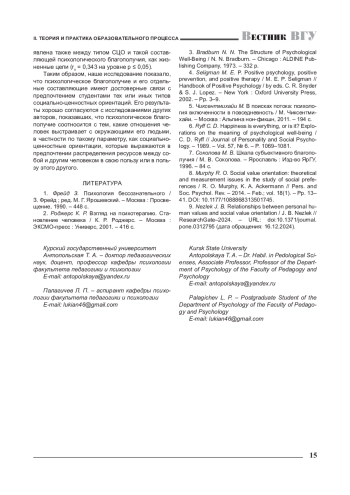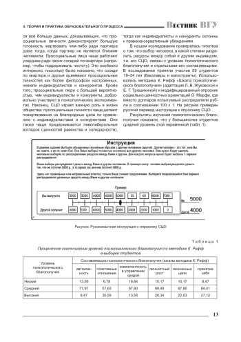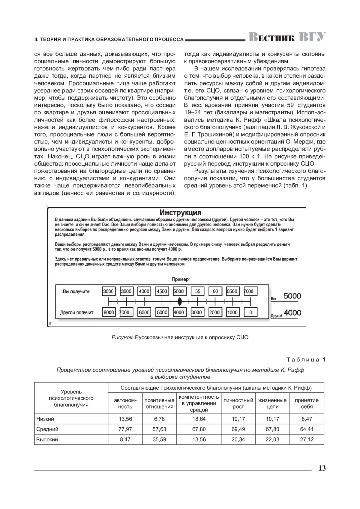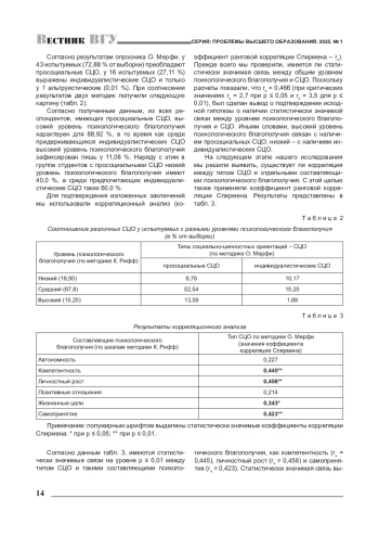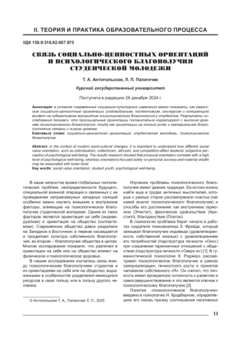 В условиях современных социально-культурных изменений важно понимать, как различные социально-ценностные ориентации (индивидуализм, коллективизм, альтруизм и конкуренция) влияют на субъективное восприятие психологического благополучия у студентов. Результаты исследования показали, что просоциальные ориентации положительно коррелируют с высоким уровнем психологического благополучия, тогда как ориентации на личный успех и материальное благосостояние связаны с низким уровнем.