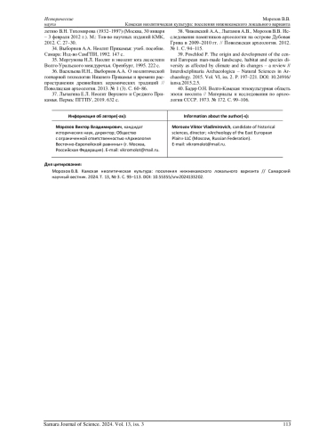 18. Морозов В.В. Керамика опорных памятников камской неолитической культуры в Нижнем Прикамье // Археология евразийских степей. 2020. № 3. С. 330-353. EDN: MNUMNG