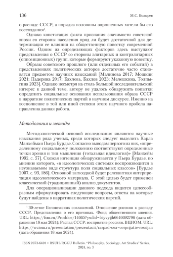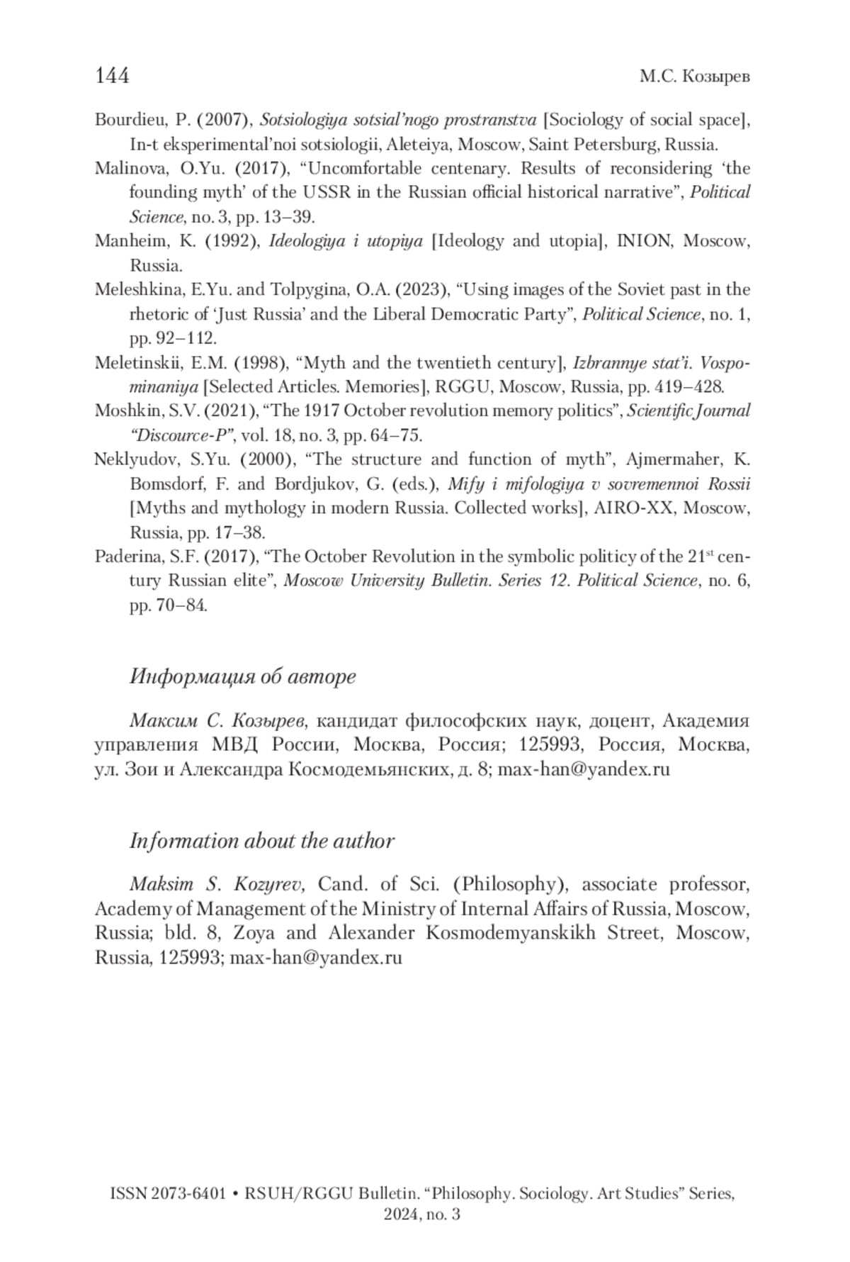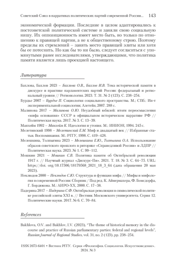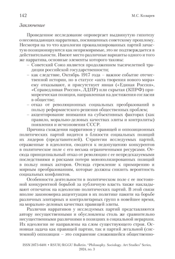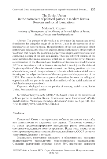 КОЗЫРЕВ М. С. СОВЕТСКИЙ СОЮЗ В НАРРАТИВАХ ПОЛИТИЧЕСКИХ ПАРТИЙ СОВРЕМЕННОЙ РОССИИ: ПРИЧИНЫ И СОЦИАЛЬНЫЕ ОСНОВАНИЯ // ВЕСТНИК РГГУ. СЕРИЯ: ФИЛОСОФИЯ. СОЦИОЛОГИЯ. ИСКУССТВОВЕДЕНИЕ. 2024. № 3