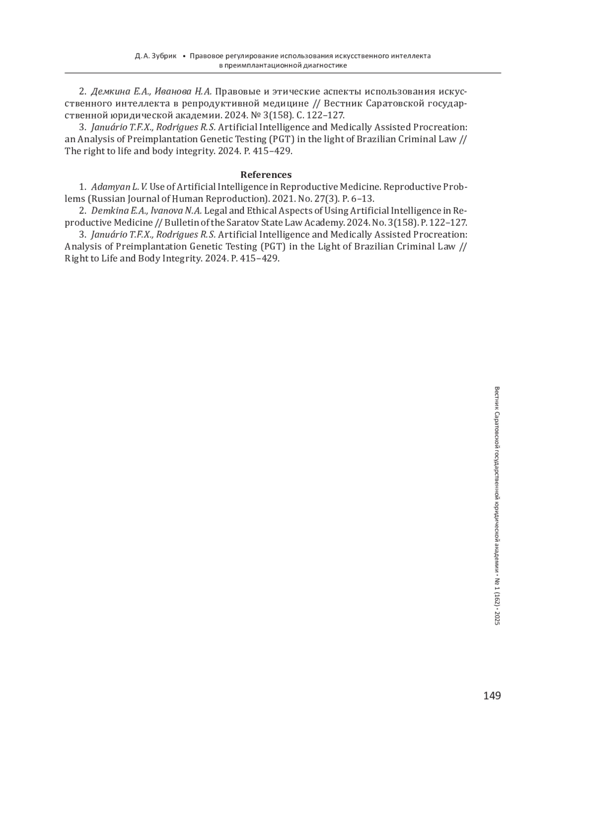 2. Демкина Е.А., Иванова Н. А. Правовые и этические аспекты использования искусственного интеллекта в репродуктивной медицине // Вестник Саратовской государственной юридической академии. 2024. № 3(158). С. 122-127.