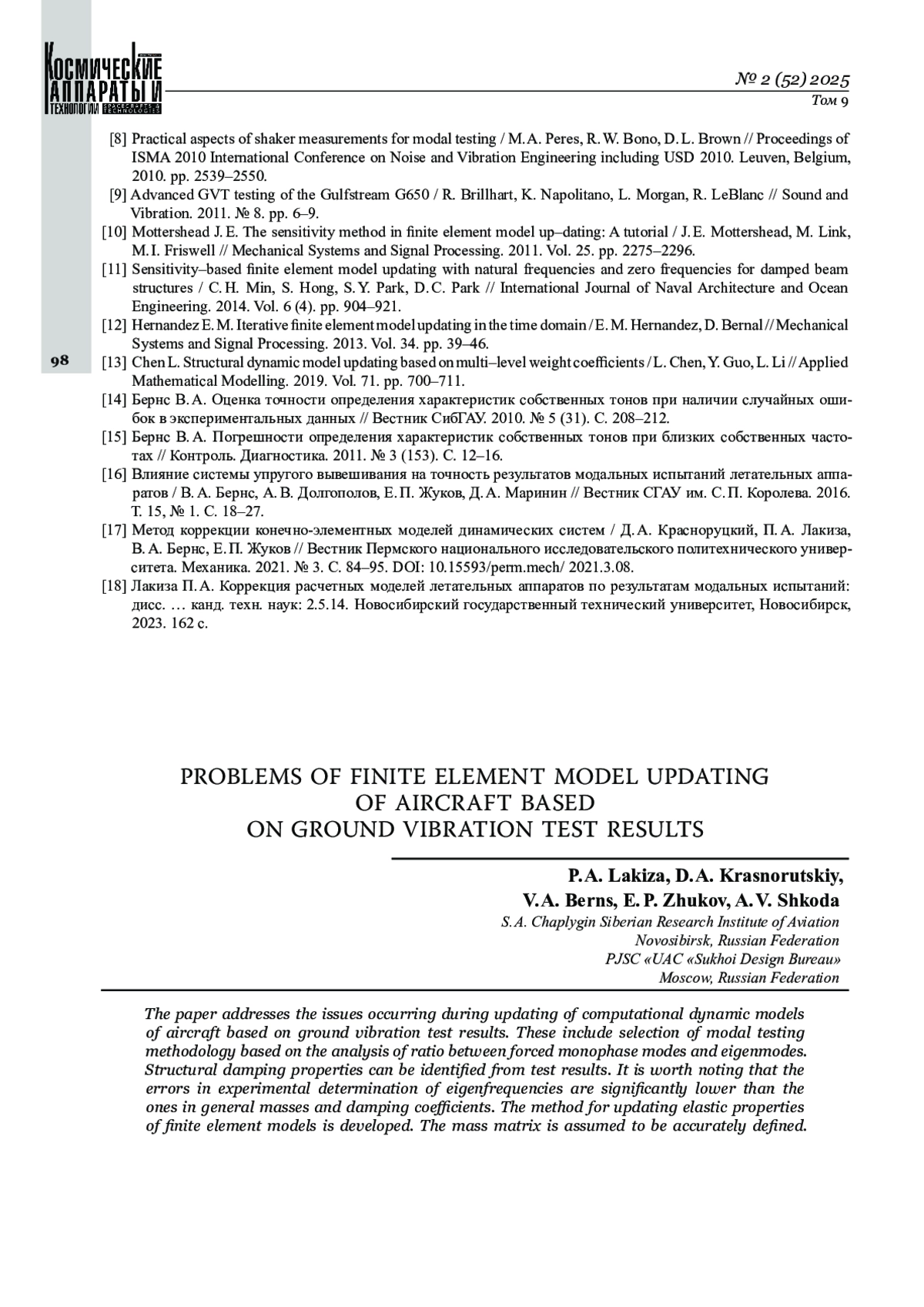 [18] Лакиза П. А. Коррекция расчетных моделей летательных аппаратов по результатам модальных испытаний: дисс. … канд. техн. наук: 2.5.14. Новосибирский государственный технический университет, Новосибирск, 2023. 162 с.