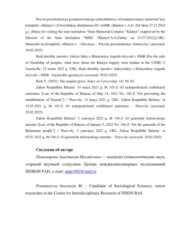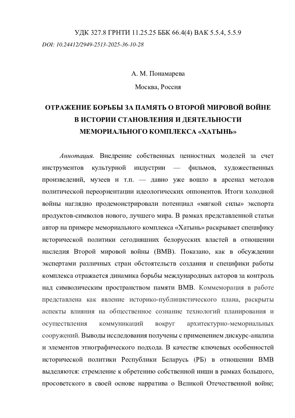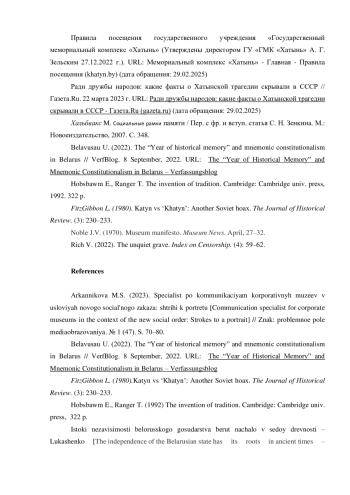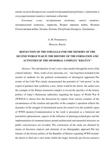 Внедрение собственных ценностных моделей за счет инструментов культурной индустрии — фильмов, художественных произведений, музеев и т. п. — давно уже вошло в арсенал методов политической переориентации идеологических оппонентов. Итоги холодной войны наглядно продемонстрировали потенциал «мягкой силы» экспорта продуктов-символов нового, лучшего мира. В рамках представленной статьи автор на примере мемориального комплекса «Хатынь» раскрывает специфику исторической политики сегодняшних белорусских властей в отношении наследия Второй мировой войны (ВМВ). Показано, как в обсуждении экспертами различных стран обстоятельств создания и специфики работы комплекса отражается динамика борьбы международных акторов за контроль над символическим пространством памяти ВМВ. Коммеморация в работе представлена как явление историко-публицистического плана, раскрыты аспекты влияния на общественное сознание технологий планирования и осуществления коммуникаций вокруг архитектурно-мемориальных сооружений. Выводы исследования получены с применением дискурс-анализа и элементов этнографического подхода. В качестве ключевых особенностей исторической политики Республики Беларусь (РБ) в отношении ВМВ выделяются: стремление к обретению собственной ниши в рамках большого, просоветского в своей основе нарратива о Великой Отечественной войне; акцент на роли Беларуси как «самой пострадавшей республике»; стремление к огосударствлению памяти о значимых событиях.