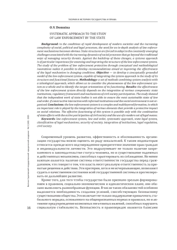 Введение: в условиях стремительного развития современных обществ и усложнения социальных, политических и правовых процессов становится очевидной необходимость углубленного изучения механизмов обеспечения правопорядка. Государственные структуры вынуждены адаптироваться к постоянно возникающим вызовам, связанным с усилением динамики общественных процессов, выходящими за рамки традиционных способов управления угрозами безопасности. На фоне этих изменений системный подход приобретает особое значение для оценки и совершенствования структуры правоохранительной системы. Исследование проблемы охраны правопорядка посредством концептуальных и методологических инноваций позволяет выработать рекомендации, направленные на повышение эффективности функционирования правового механизма в изменяющихся условиях. Цель - разработать концептуально обоснованную модель правоохранительной системы, способную интегрировать системный подход в изучение ее структуры и функциональных особенностей.