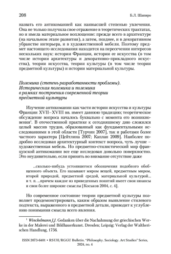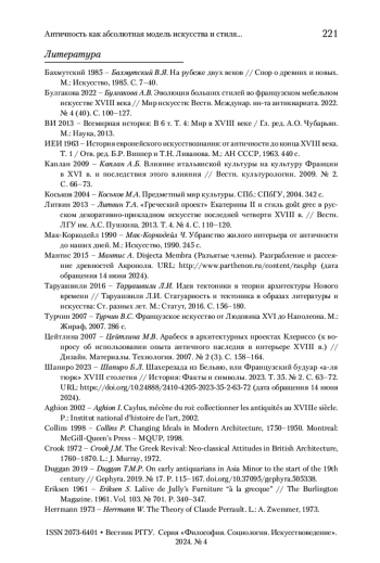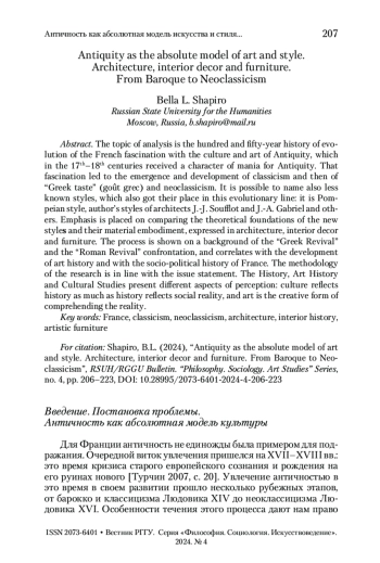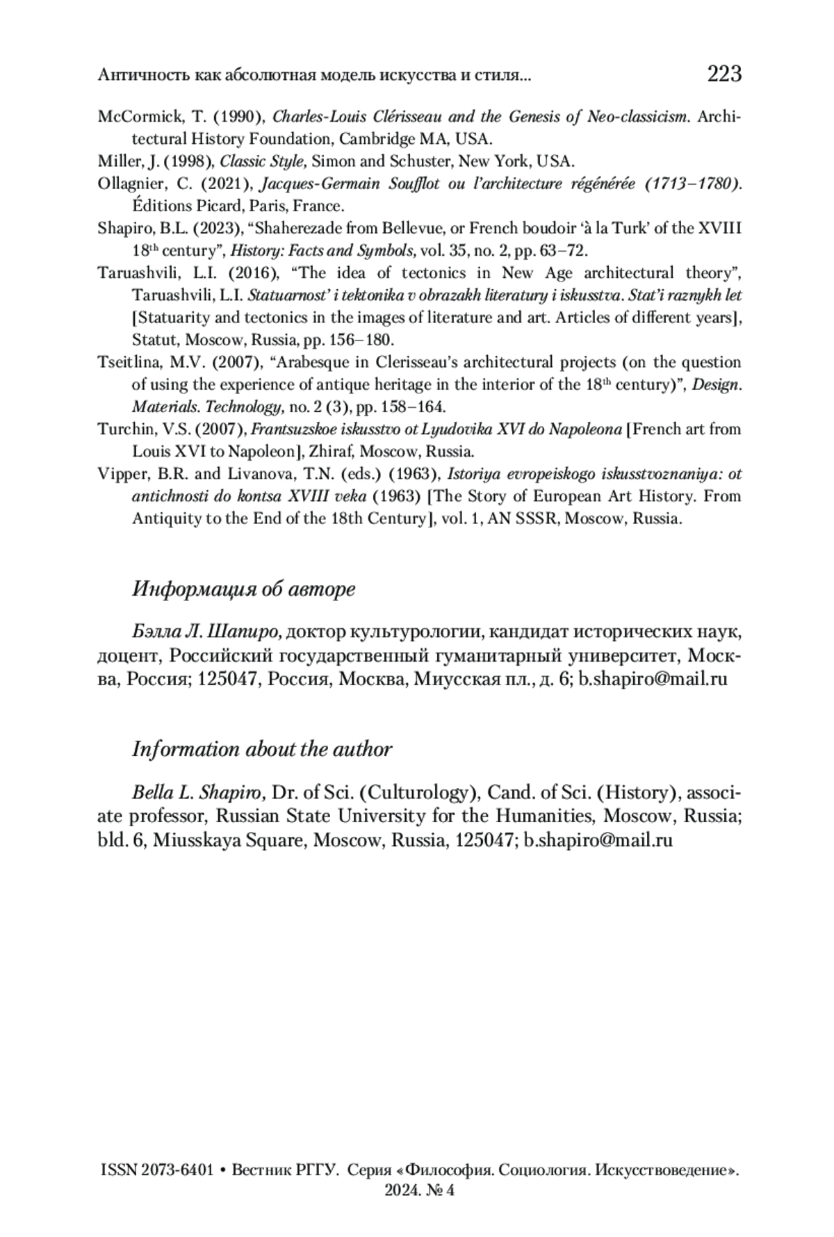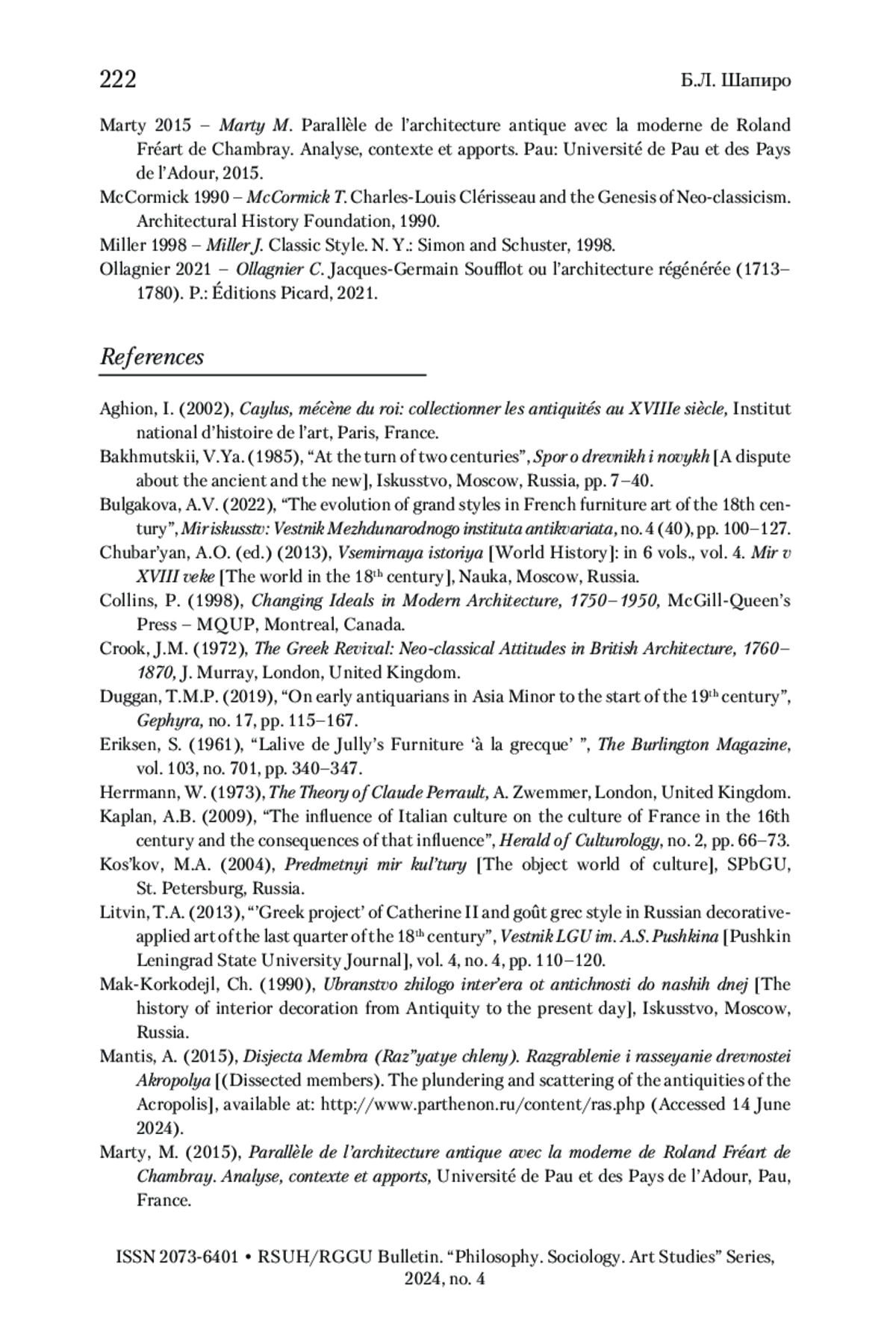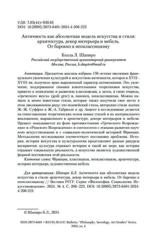 ШАПИРО Б. Л. АНТИЧНОСТЬ КАК АБСОЛЮТНАЯ МОДЕЛЬ ИСКУССТВА И СТИЛЯ: АРХИТЕКТУРА, ДЕКОР ИНТЕРЬЕРА И МЕБЕЛЬ. ОТ БАРОККО К НЕОКЛАССИЦИЗМУ // ВЕСТНИК РГГУ. СЕРИЯ: ФИЛОСОФИЯ. СОЦИОЛОГИЯ. ИСКУССТВОВЕДЕНИЕ. 2024. № 4