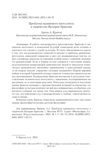 В работе анализируются представления Брюсова о машинном интеллекте и возможной будущей социальной роли техники в контексте его учения о судьбе культуры. В статье обосновывается мысль о том, что для выдающегося символиста интерес к проблеме машинного интеллекта, нашедший отражение в двух его незавершенных текстах, не был случайным эпизодом, не имевшим особой связи с главными линиями его размышлений. Если в первом из них говорится о восстании машин, подготовленном возрастающей зависимостью людей от продуктов технического производства, масштабно применяемых в повседневной жизни, то во втором находит отражение ситуация начавшейся Первой мировой войны, в которой Германией сделана ставка на техническое превосходство над противниками. Размышления Брюсова интересны и актуальны сопоставлением человеческого интеллекта с машинным, подчеркиваемым им различием, но и некоторым родством. Поскольку возможность восстания машин Брюсов связывает с предшествующей историей человечества, его философия культуры включает целый ряд непривычных, необычных для научного сознания его эпохи тем. Они важны для современного читателя тем, что побуждают его к размышлениям о свободе, ответственности, смысле жизни.
