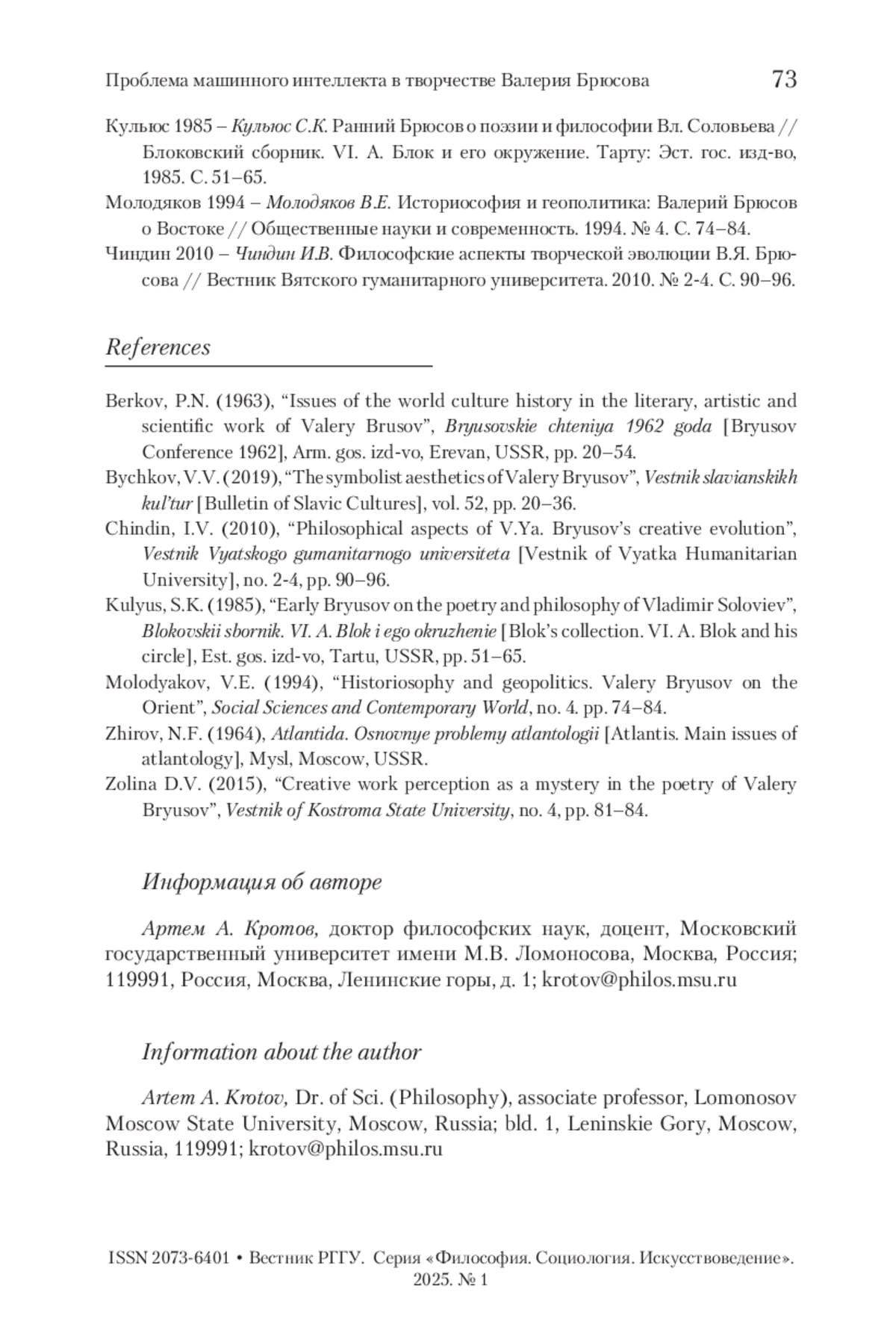 2. Бычков 2019 - Бычков В.В. Символистская эстетика Валерия Брюсова // Вестник славянских культур, 2019. Т. 52. С. 20-36.