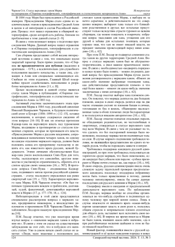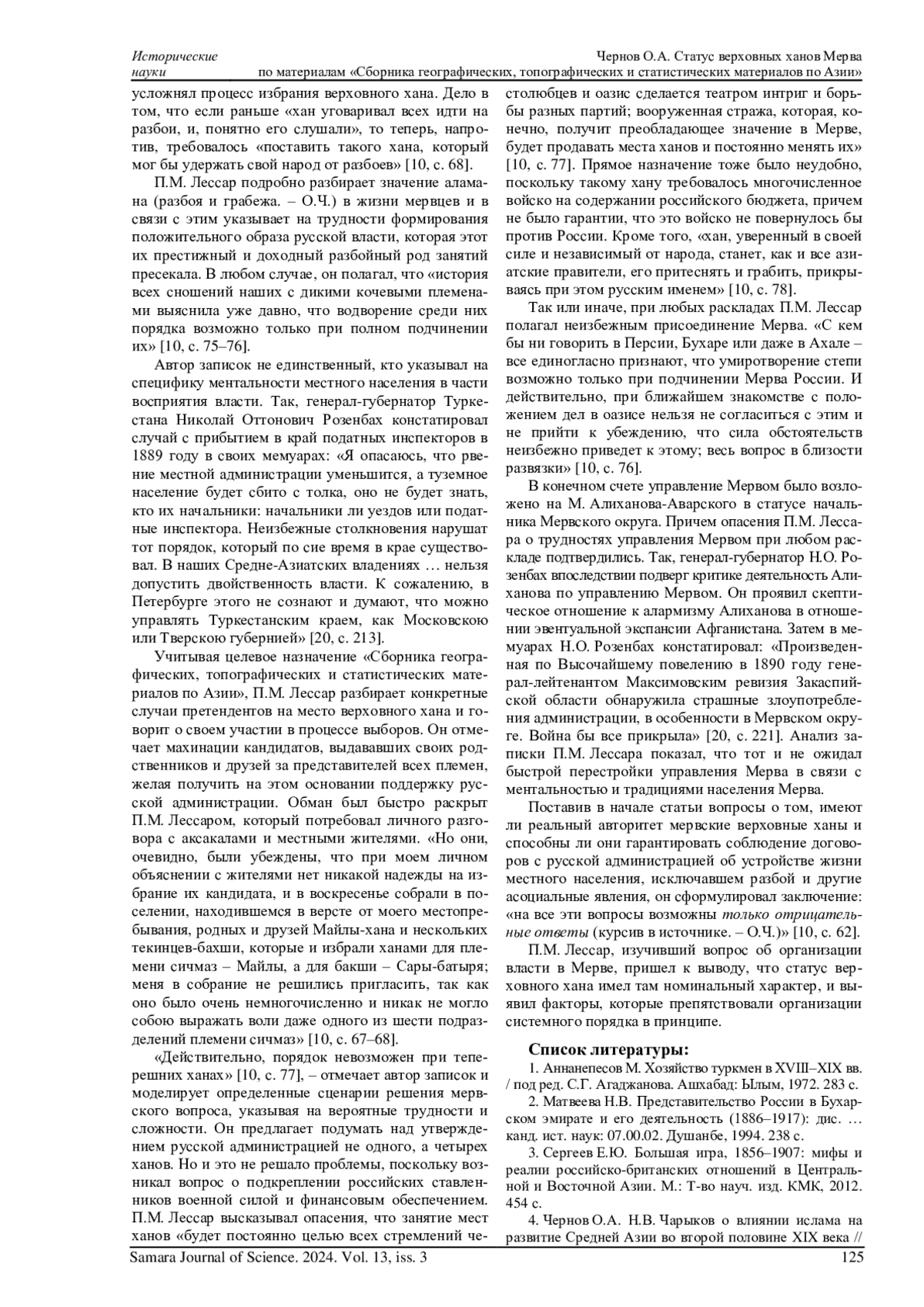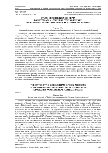 Тема представленной статьи связана с историческим фактом присоединения среднеазиатской территории Мерв к Российской империи в 1884 году. Это событие стало одним из заключительных этапов в присоединении Средней Азии в целом и её интеграции в состав Российской империи. Процесс этот отражён в обширной историографии, среди которой есть работы, близкие по проблематике к теме данной статьи. Автор акцентирует внимание на подготовке присоединения Мерва. Данный вопрос нашел отражение в «Сборнике географических, топографических и статистических материалов по Азии» за 1883 год. Целью исследования в данной статье является статус мервских ханов в публикациях указанного сборника. Небезынтересным представляется специальное рассмотрение вопроса о мервских ханах, предпринятое инженером, а впоследствии дипломатом и преемником Николая Валерьевича Чарыкова Павлом Михайловичем Лессаром накануне присоединения Мерва. Вопрос о статусе мервских ханов был не абстрактно-теоретическим, а имел важное практическое значение. В связи с необходимостью установить порядок в Мерве, нужно было понять - можно ли решить данную проблему без присоединения Мерва путем достижения договоренности с мервским ханом. В любом случае П. М. Лессар полагал неизбежным присоединение Мерва. Поставив в начале своей статьи вопросы о том, имеют ли реальный авторитет мервские верховные ханы и способны ли они гарантировать соблюдение договоров с русской администрацией об устройстве жизни местного населения, исключавшем разбой и другие асоциальные явления, он сформулировал заключение: на все эти вопросы возможны только отрицательные ответы. П. М. Лессар, изучивший организацию власти в Мерве, пришел к выводу, что статус верховного хана носит там номинальный характер, и выявил факторы, которые препятствовали организации системного порядка в принципе.