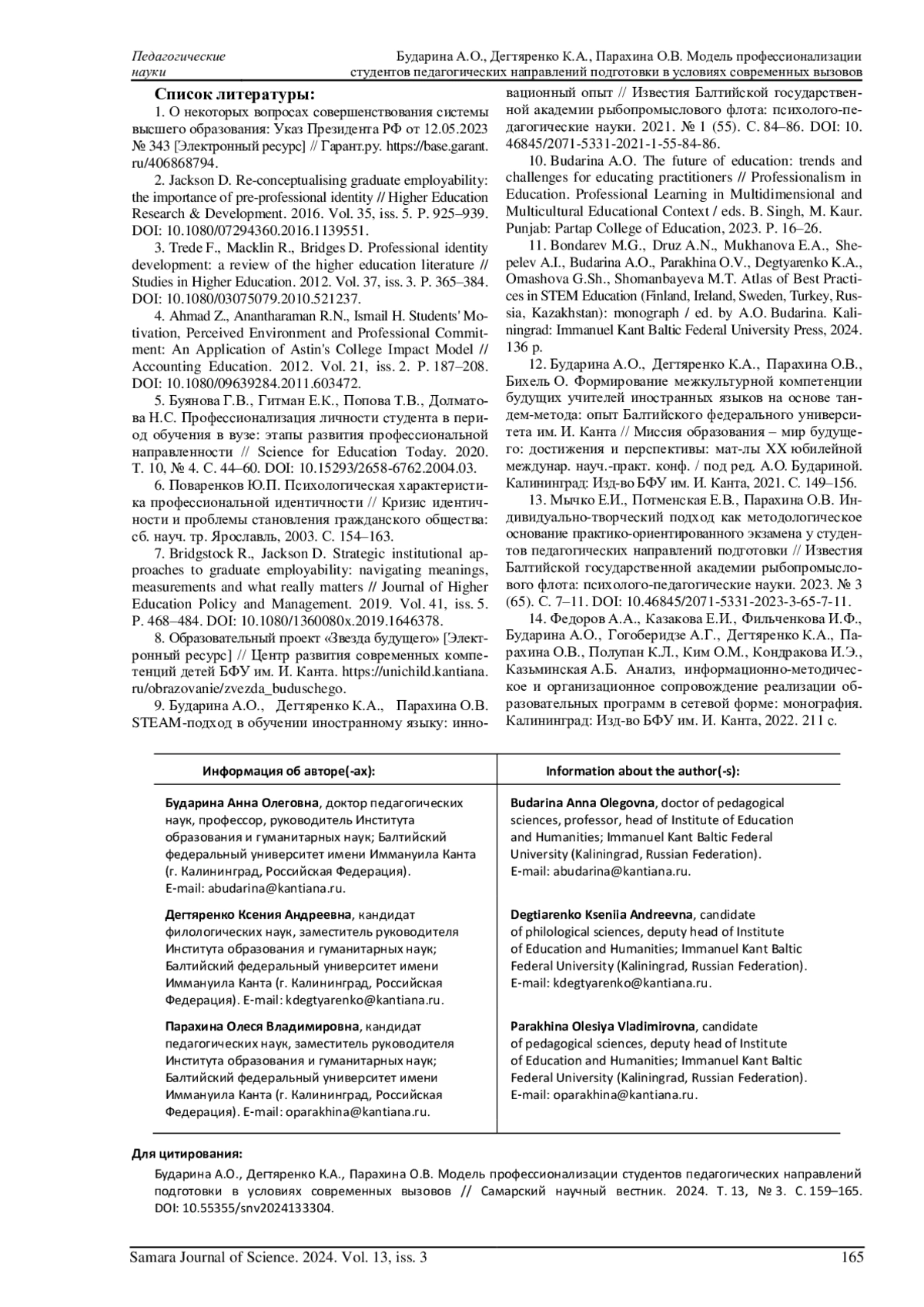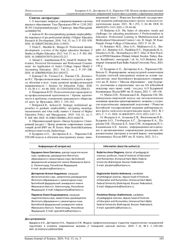 10. Budarina A.O. The future of education: trends and challenges for educating practitioners // Professionalism in Education. Professional Learning in Multidimensional and Multicultural Educational Context / eds. B. Singh, M. Kaur. Punjab: Partap College of Education, 2023. P. 16-26.