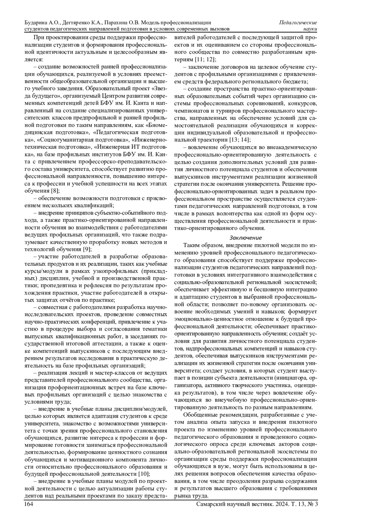 13. Мычко Е.И., Потменская Е.В., Парахина О.В. Индивидуально-творческий подход как методологическое основание практико-ориентированного экзамена у студентов педагогических направлений подготовки // Известия Балтийской государственной академии рыбопромыслового флота: психолого-педагогические науки. 2023. № 3 (65). С. 7-11. DOI: 10.46845/2071-5331-2023-3-65-7-11 EDN: OSDCKM