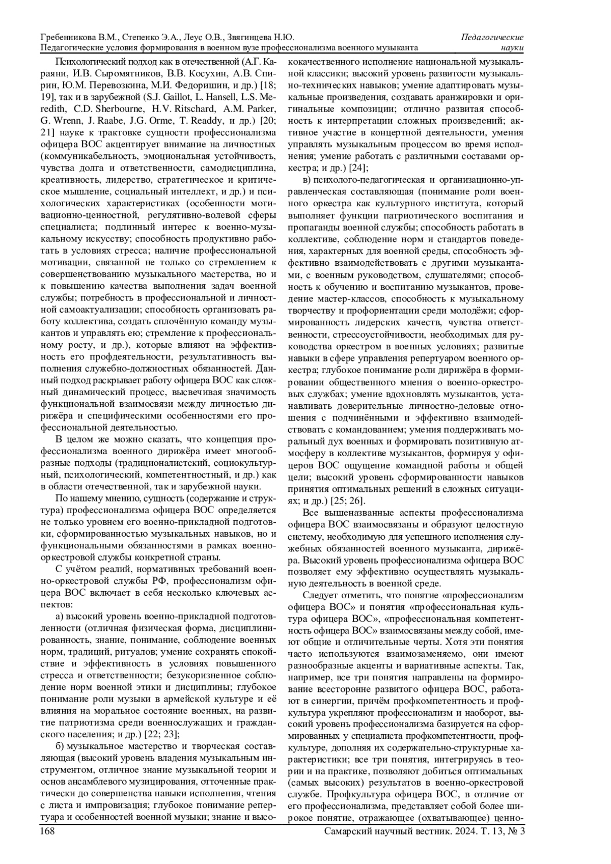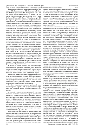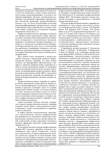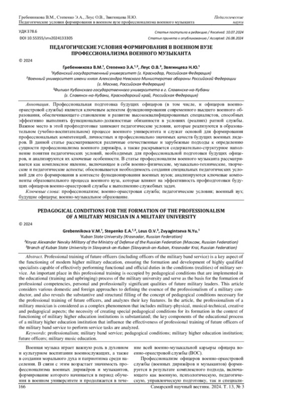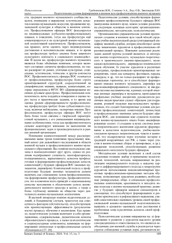 Профессиональная подготовка будущих офицеров (в том числе, и офицеров военно-оркестровой службы) является ключевым аспектом функционирования современного высшего военного образования, обеспечивающего становление и развитие высококвалифицированных специалистов, способных эффективно выполнять функционально-должностные обязанности в условиях (реалиях) ратной службы. Важное место в этой профподготовке занимают педагогические условия, которые реализуются в образовательном (учебно-воспитательном) процессе военного университета и служат основой для формирования профессиональных компетенций, личностных и профессионально значимых качеств будущих военных лидеров. В данной статье рассматриваются различные отечественные и зарубежные подходы к определению сущности профессионализма военного дирижёра, а также раскрывается содержательно-структурное наполнение понятия педагогических условий, необходимых для профессиональной подготовки будущих офицеров, и анализируются их ключевые особенности. В статье профессионализм военного музыканта рассматривается как комплексное явление, включающее в себя военно-физические, музыкально-технические, творческие и педагогические аспекты; обосновывается необходимость создания специальных педагогических условий для его формирования в контексте функционирования военных вузов; анализируются ключевые компоненты образовательного процесса военного вуза, которые влияют на эффективность профподготовки будущих офицеров военно-оркестровой службы к выполнению служебных задач.