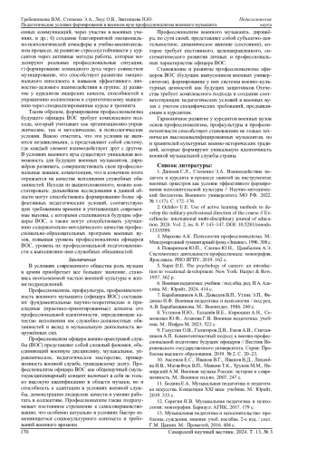 1. Джиоев С.Л., Степенко Э.А. Взаимодействие педагога и курсанта в процессе занятий на инструментах военных оркестров как условие эффективного формирования исполнительской культуры // Научно-методический бюллетень Военного университета МО РФ. 2022. № 1 (17). С. 172-176. EDN: MHQKQH