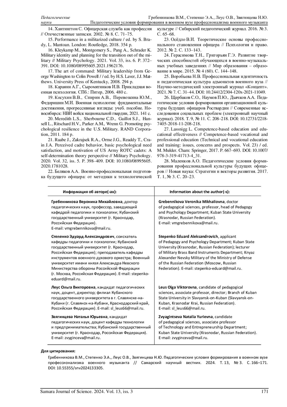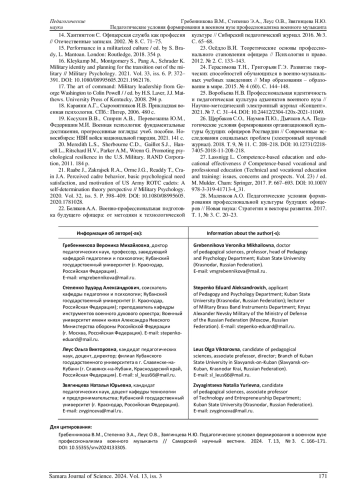 25. Воробьева Н.В. Профессиональная идентичность и педагогическая культура адъюнктов военного вуза // Научно-методический электронный журнал “Концепт”. 2021. № 7. С. 31-44. DOI: 10.24412/2304-120x-2021-11049 EDN: BTPDJQ