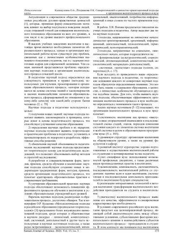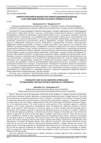 В статье раскрывается значение воспитания в условиях современного вуза и обосновывается необходимость определения научных подходов к организации воспитательного процесса в высшей школе. Раскрываются особенности организации воспитательной работы в вузе: системность; уровневая структура; развитый институт кураторства; учет специфики вуза; целеполагание, комплексность, систематичность, последовательность воспитательной работы со студентами; реализация интерактивных технологий и методов воспитания; диагностика воспитательного процесса. Выявляются основные положения синергетического подхода в образовании (открытость системы; нелинейность; неравновесные состояния; самоорганизация; бифуркация; влияние флуктуаций), в контексте которых воспитание в вузе предстает как открытый, нелинейный и самоорганизующийся процесс. Раскрывается назначение синергетического подхода к организации воспитательного процесса в вузе, которое заключается в том, что данный подход, способствуя систематическому и последовательному обмену знаниями, ценностями между субъектами воспитания, приращению ценностной сферы сознания студентов новыми ценностями, обеспечивает создание условий для принятия студентами ответственных решений и осуществления морального выбора, являющегося предпосылкой для побуждения студентов к самовоспитанию. Выявляются основные положения ценностно-ориентационного подхода (актуализация и обогащение системы ценностей; интеграция ценностей в контекст профессиональной подготовки; учет индивидуальных ценностных особенностей студентов; развитие ценностной рефлексии студентов; проектирование ценностно-ориентированной образовательной среды), актуальные в контексте организации воспитательного процесса в высшей школе. Раскрывается назначение ценностно-ориентационного подхода к организации воспитательного процесса в вузе, которое заключается в том, что данный подход, способствуя созданию ценностно-ориентационного поля, обеспечивает развитие способности студентов ориентироваться в образующих его содержание ценностях, готовности осуществлять рефлексию процесса обмена ценностями во взаимодействии с другими людьми.