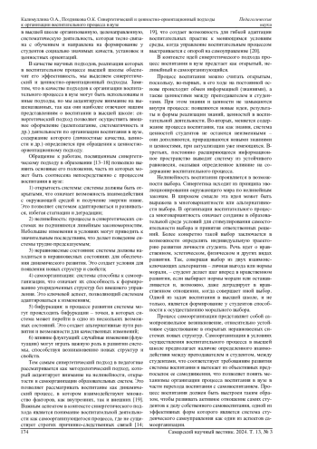 18. Швецова В.А., Пчелкина Е.П. Синергетический подход к обучению студентов в системе высшего профессионального образования // Историческая и социально-образовательная мысль. 2017. Т. 9, № 3-1. С. 192-196. EDN: YSSZWR