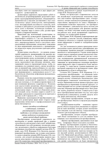 Обоснована целесообразность обращения к фундаментальным закономерностям преобразования природных и социальных объектов в объяснении перехода одаренности от уровня «природный дар» к уровню «способности». Рассматривается вопрос преобразования малоизученного феномена «дуовекторная одаренность» в контексте более широкого понятия «одаренность». Сделана попытка раскрыть механизмы изменений природного дара ребенка, фундаментальность которых позволяет выдвинуть предположение о том, почему закономерна тенденция видов одаренности проявляться не в единственной сфере деятельности, а, оставаясь взаимосвязанными, образовывать устойчивые дуовекторные пары. Автор уточняет понятия «дуовекторная одаренность», «природный дар», «дуовекторные способности». Трактовки понятия «преобразование» в кибернетике, биологии, психологии, педагогике даны в ракурсе исходных формулировок и в проекции на исследуемый феномен дуовекторной одаренности, в его динамике, различных проявлениях. Показано отсутствие противоречий между научным обоснованием формирующейся концепции преобразования дуовекторной одаренности дошкольников и уже известными научными концепциями феномена «преобразование». Согласно материалам статьи, преобразование природного дара ребенка в дуовекторную одаренность уровня «способности» охарактеризовано как основанный на фундаментальных закономерностях существования сложных объектов и направляемый педагогической технологией процесс изменений поведения, проявляющийся в его переходе на качественно новый уровень в двух взаимосвязанных сферах.