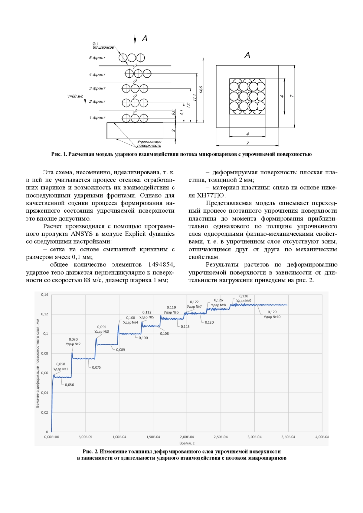 В статье представлена математическая модель взаимодействия потока сыпучих тел, осуществляющих ударное взаимодействие с упрочняемой поверхностью. Модель позволяет решить деформационную задачу по формированию поверхностного слоя упрочняемой поверхности, характеризующегося однородностью физико-механических характеристик: толщиной, величиной напряжений и характером распределения