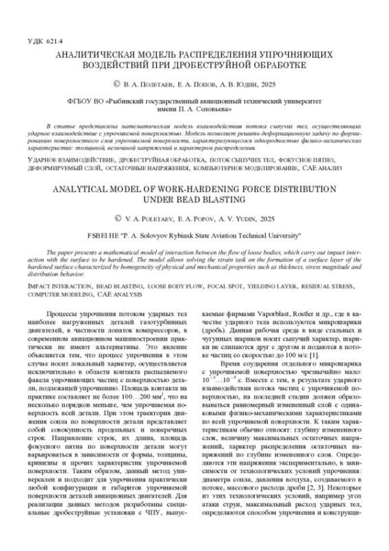 Процессы упрочнения потоком ударных тел наиболее нагруженных деталей газотурбинных двигателей, в частности лопаток компрессоров, в современном авиационном машиностроении практически не имеют альтернативы. Это явление объясняется тем, что процесс упрочнения в этом случае носит локальный характер, осуществляется исключительно в области контакта распыляемого факела упрочняющих частиц с поверхностью детали, подлежащей упрочнению. Площадь контакта на практике составляет не более 100…200 мм2, что на несколько порядков меньше, чем упрочняемая поверхность всей детали. При этом траектория движения сопла по поверхности детали представляет собой совокупность продольных и поперечных строк. Направление строк, их длина, площадь фокусного пятна по поверхности детали могут варьироваться в зависимости от формы, толщины, кривизны и прочих характеристик упрочняемой поверхности