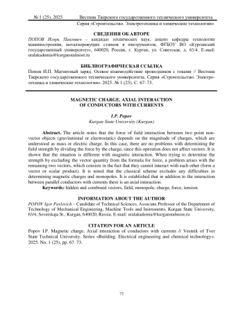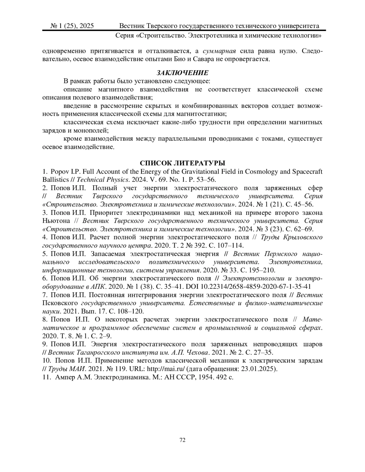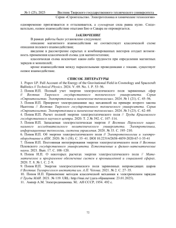 2. Попов И.П. Полный учет энергии электростатического поля заряженных сфер // Вестник Тверского государственного технического университета. Серия “Строительство. Электротехника и химические технологии”. 2024. № 1 (21). С. 45-56. EDN: KMUMKI