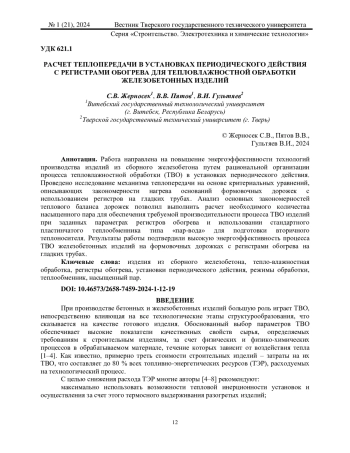 При производстве бетонных и железобетонных изделий большую роль играет ТВО, непосредственно влияющая на все технологические этапы структурообразования, что сказывается на качестве готового изделия. Обоснованный выбор параметров ТВО обеспечивает высокие показатели качественных свойств сырья, определяемых требованиям к строительным изделиям, за счет физических и физико-химических процессов в обрабатываемом материале, течение которых зависит от воздействия тепла [1–4]. Как известно, примерно треть стоимости строительных изделий – затраты на их ТВО, что составляет до 80 % всех топливно-энергетических ресурсов (ТЭР), расходуемых на технологический процесс.