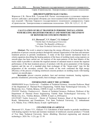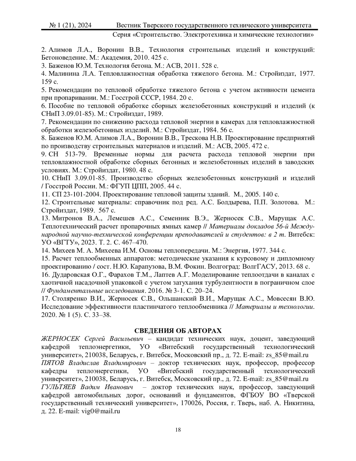 13. Митронов В.А., Лемешев А.С., Семенник В.Э., Жерносек С.В., Марущак А.С. Теплотехнический расчет пропарочных ямных камер // Материалы докладов 56-й Международной научно-технической конференции преподавателей и студентов: в 2 т. Витебск: УО “ВГТУ”, 2023. Т. 2. С. 467-470. EDN: OGEHFS