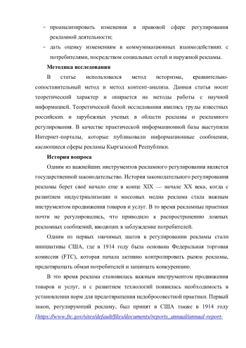 Статья анализирует эволюцию законодательства в сфере рекламы, с акцентом на изменения, происходящие в Кыргызстане. Рассматриваются международные и национальные инициативы, направленные на улучшение этики рекламы и защиту прав потребителей. Особое внимание уделяется внедрению законов. Оценивается влияние современных законодательных изменений на рекламный рынок, особенно в контексте глобальных тенденций и растущего спроса на этичную и ориентированную на потребителя рекламу.