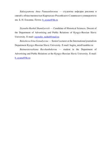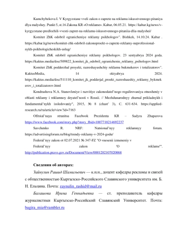 ЗАЙНУЛИН Р. Ш., БАЛАШОВА И. Г., БАЙМУРАТОВА А. Р. ТРАНСФОРМАЦИОННЫЕ ПРОЦЕССЫ В СФЕРЕ РЕГУЛИРОВАНИЯ РЕКЛАМНОЙ ДЕЯТЕЛЬНОСТИ В КЫРГЫЗСТАНЕ // РОССИЙСКАЯ ШКОЛА СВЯЗЕЙ С ОБЩЕСТВЕННОСТЬЮ. 2025. № 36