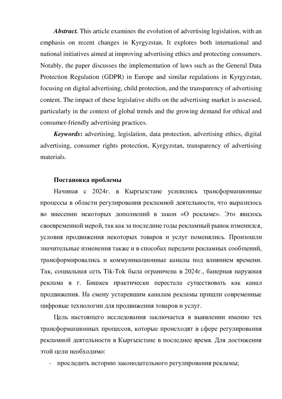 Статья: ТРАНСФОРМАЦИОННЫЕ ПРОЦЕССЫ В СФЕРЕ РЕГУЛИРОВАНИЯ РЕКЛАМНОЙ ДЕЯТЕЛЬНОСТИ В КЫРГЫЗСТАНЕ (2025)