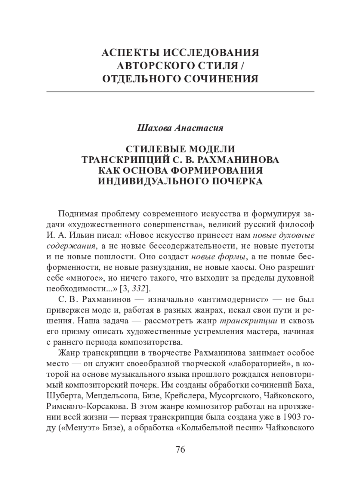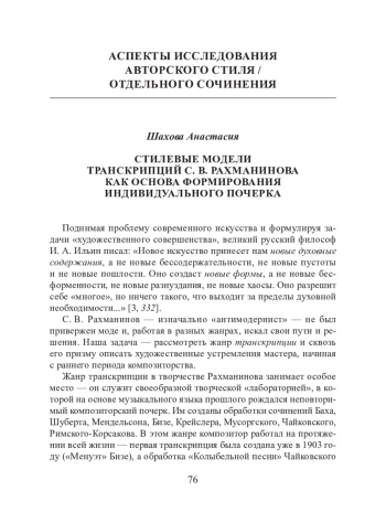 ШАХОВА А. СТИЛЕВЫЕ МОДЕЛИ ТРАНСКРИПЦИЙ С. В. РАХМАНИНОВА КАК ОСНОВА ФОРМИРОВАНИЯ ИНДИВИДУАЛЬНОГО ПОЧЕРКА // ИССЛЕДОВАНИЯ МОЛОДЫХ МУЗЫКОВЕДОВ. 2024. № 8