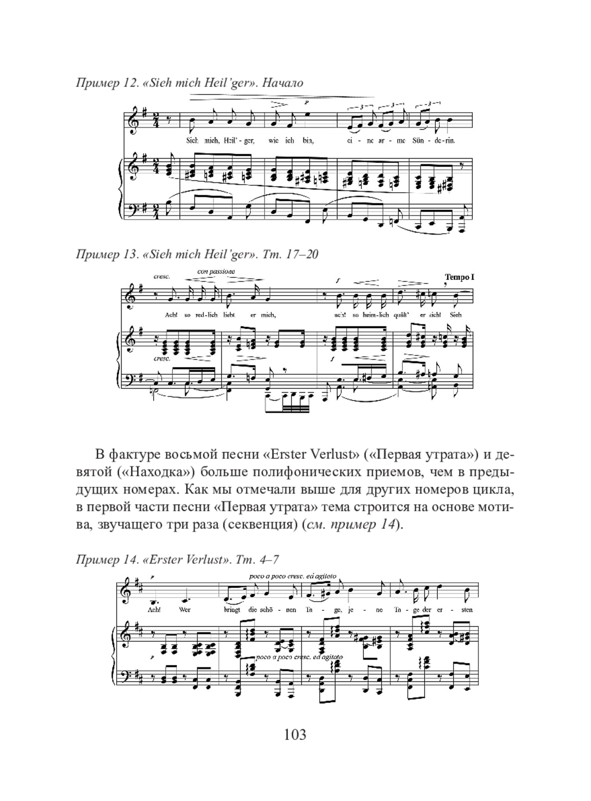 Как известно, Танеев был мастером полифонии и внес значительный вклад в ее развитие. В фактуре произведений Метнера полифонические приемы также очень важны — как в изложении материала, так и в его развитии. Но учился ли Николай Карлович полифонии? Несомненно, учился, но довольно необычным способом. Приведу цитату из воспоминаний Анны Михайловны Метнер, жены композитора: «По композиции Николай Карлович консерватории не окончил. Даже курс теоретических предметов, обязательных для всех пианистов, он прошел не полностью. В частности, он числился в 1897/98 учебном году в классе контрапункта, который вел С. И. Танеев, но фактически перестал посещать эти занятия со второго полугодия» [2, 37].
