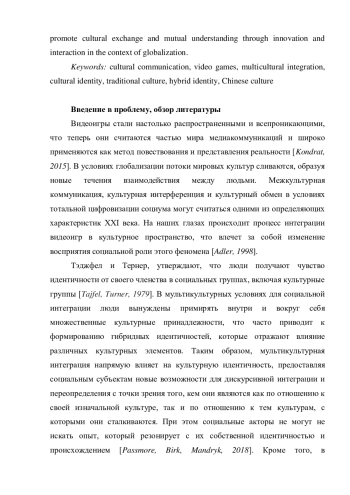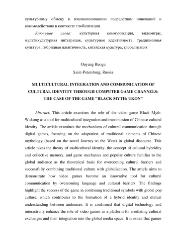Статья посвящена исследованию роли видеоигры «Черный миф: Укун» как инструмента мультикультурной интеграции и трансляции китайской культурной идентичности. В статье рассматривается механизмы культурной коммуникации через цифровые игры, фокусируясь на адаптации традиционных элементов китайской мифологии (на основе романа «Путешествие на Запад») в глобальном дискурсе. В качестве теоретической основы данной статьи взята теория мультикультурной идентичности, концепция культурной гибридности и коллективной памяти, и игровая механика и популярная культура, знакомые глобальной аудитории, для преодоления культурных барьеров и успешного сочетания традиционной культуры с глобализацией. Цель статьи заключается в демонстрации того, как видеоигры становятся инновационным инструментом культурной коммуникации, преодолевая языковые и культурные барьеры. Выводы подчеркивают успех игры в сочетании традиционных символов с глобальной поп-культурой, что способствует формированию гибридной идентичности и взаимопониманию между аудиториями. Подтверждено, что цифровые технологии и интерактивность усиливают роль видеоигр как платформы для посредничества культурных обменов и их интеграции в мировое медиапространство. При этом отмечается, что игры способствуют культурному обмену и взаимопониманию посредством инноваций и взаимодействию в контексте глобализации.