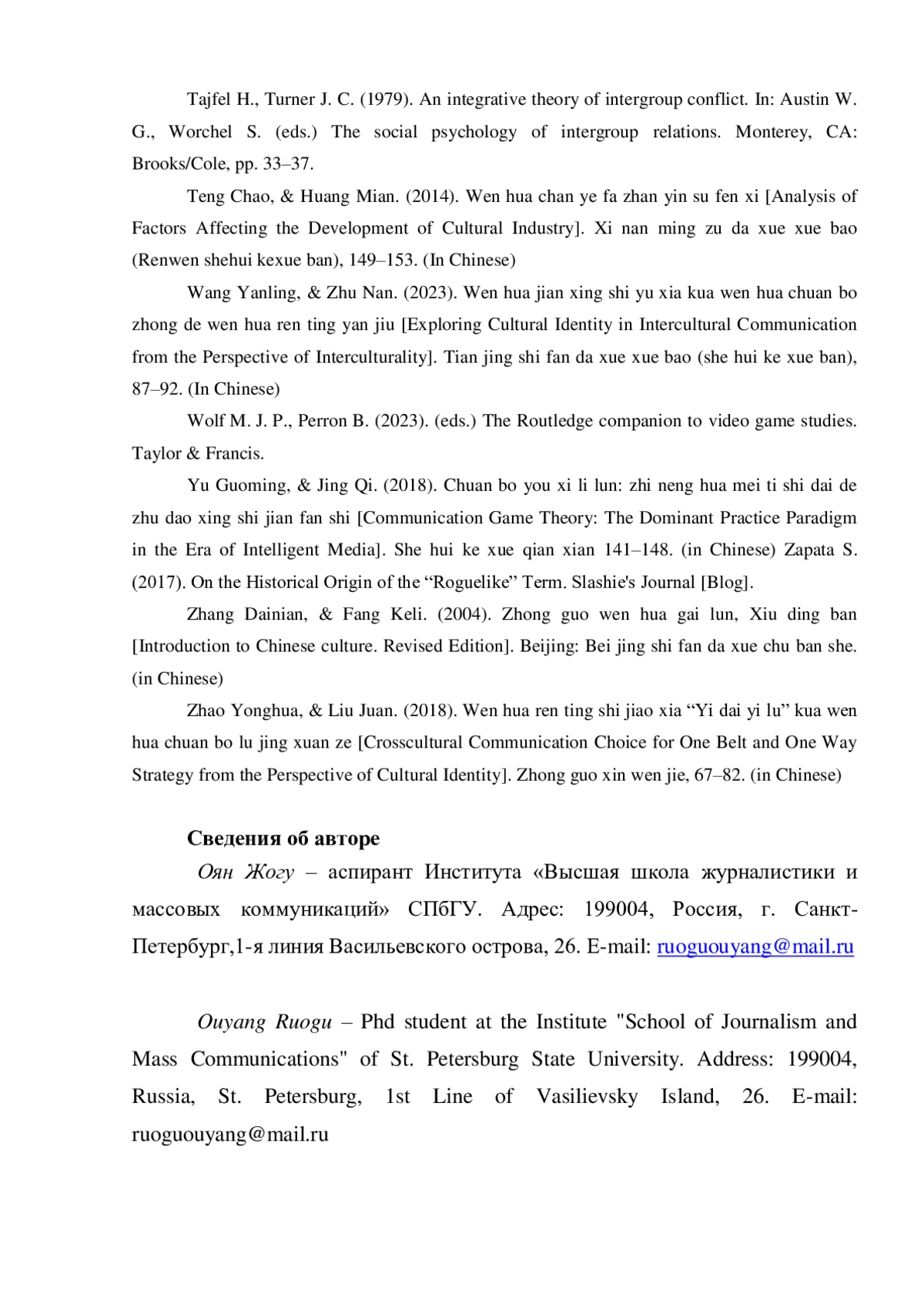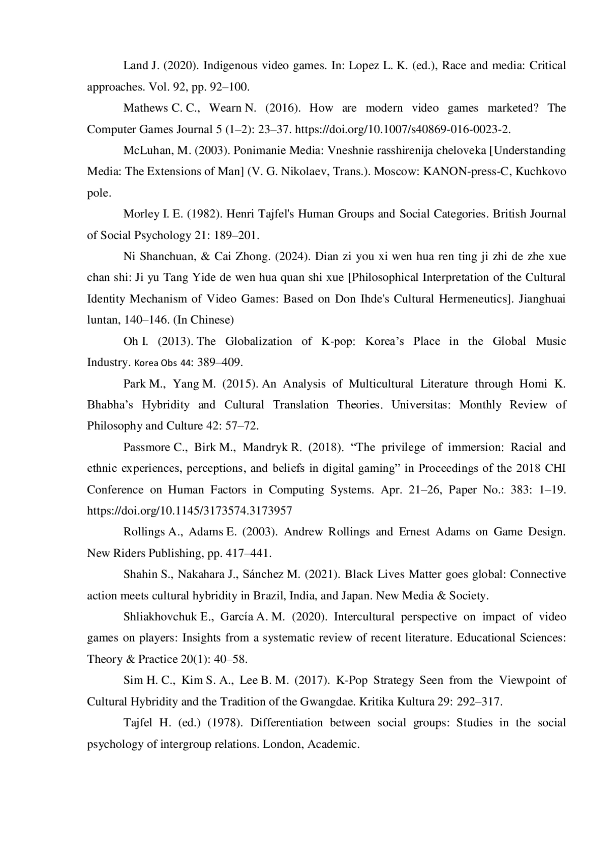 11. 倪山川,蔡仲.电子游戏文化认同机制的哲学阐释-基于唐·伊德的文化诠释学[J].江淮论坛,2024, (03): 140-146. (Ни Шаньчуань, Цай Чжун. Философская интерпретация механизма культурной идентичности видеоигр, основанная на культурной герменевтике Дона Ихде // Форум Цзянхуай. 2024. № 3. С. 140-146) (на кит. яз.).