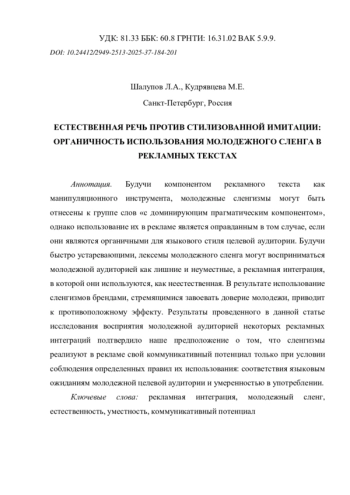 Статья: ЕСТЕСТВЕННАЯ РЕЧЬ ПРОТИВ СТИЛИЗОВАННОЙ ИМИТАЦИИ: ОРГАНИЧНОСТЬ ИСПОЛЬЗОВАНИЯ МОЛОДЕЖНОГО СЛЕНГА В РЕКЛАМНЫХ ТЕКСТАХ (2025)