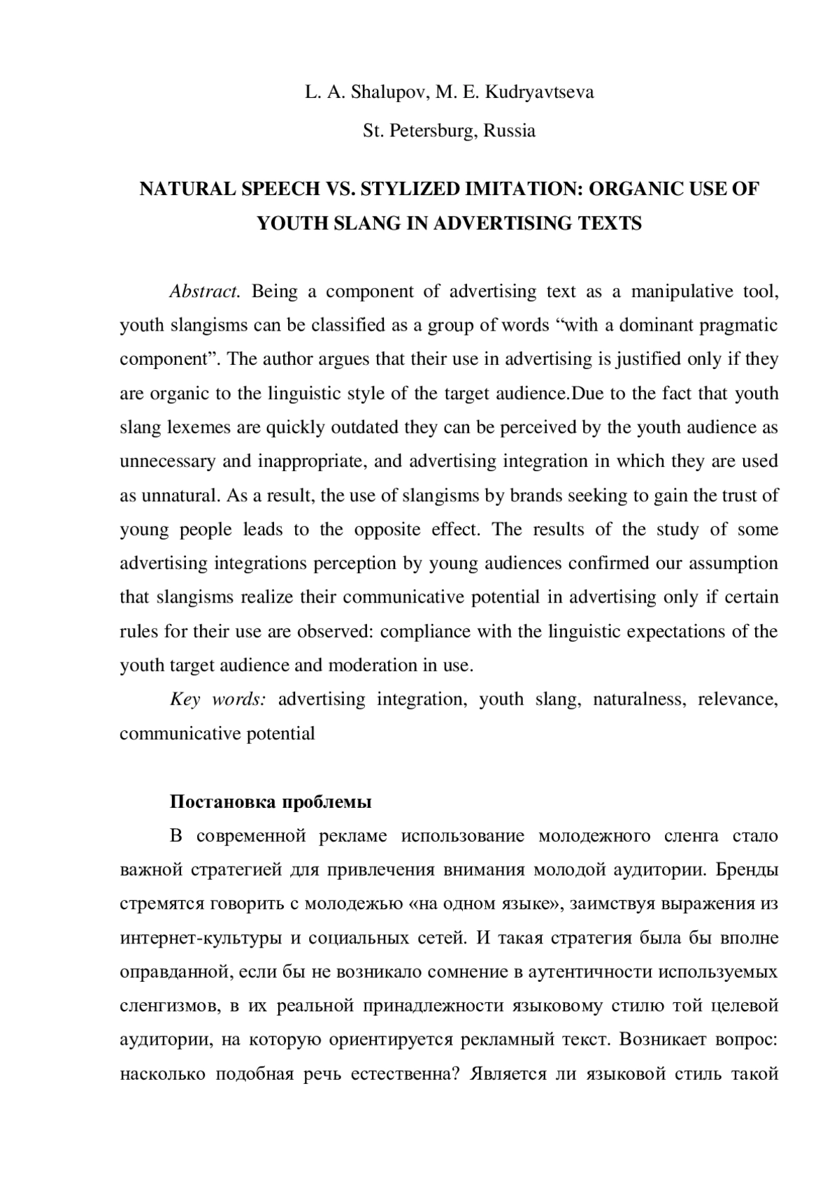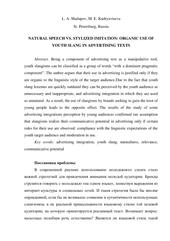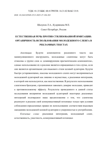 ШАЛУПОВ Л. А., КУДРЯВЦЕВА М. Е. ЕСТЕСТВЕННАЯ РЕЧЬ ПРОТИВ СТИЛИЗОВАННОЙ ИМИТАЦИИ: ОРГАНИЧНОСТЬ ИСПОЛЬЗОВАНИЯ МОЛОДЕЖНОГО СЛЕНГА В РЕКЛАМНЫХ ТЕКСТАХ // РОССИЙСКАЯ ШКОЛА СВЯЗЕЙ С ОБЩЕСТВЕННОСТЬЮ. 2025. № 37