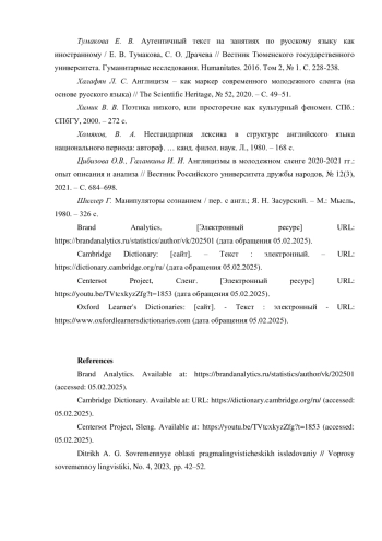Будучи компонентом рекламного текста как манипуляционного инструмента, молодежные сленгизмы могут быть отнесены к группе слов «с доминирующим прагматическим компонентом», однако использование их в рекламе является оправданным в том случае, если они являются органичными для языкового стиля целевой аудитории. Будучи быстро устаревающими, лексемы молодежного сленга могут восприниматься молодежной аудиторией как лишние и неуместные, а рекламная интеграция, в которой они используются, как неестественная. В результате использование сленгизмов брендами, стремящимися завоевать доверие молодежи, приводит к противоположному эффекту. Результаты проведенного в данной статье исследования восприятия молодежной аудиторией некоторых рекламных интеграций подтвердило наше предположение о том, что сленгизмы реализуют в рекламе свой коммуникативный потенциал только при условии соблюдения определенных правил их использования: соответствия языковым ожиданиям молодежной целевой аудитории и умеренностью в употреблении.