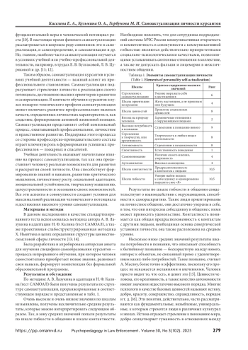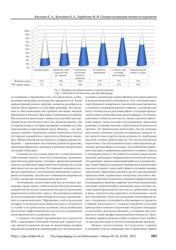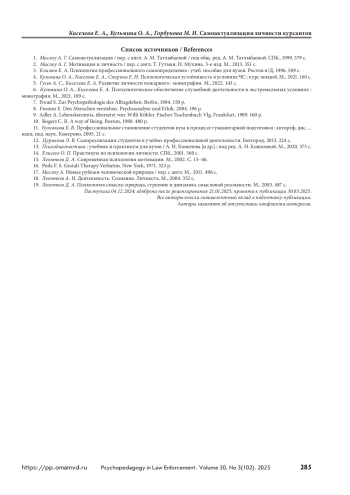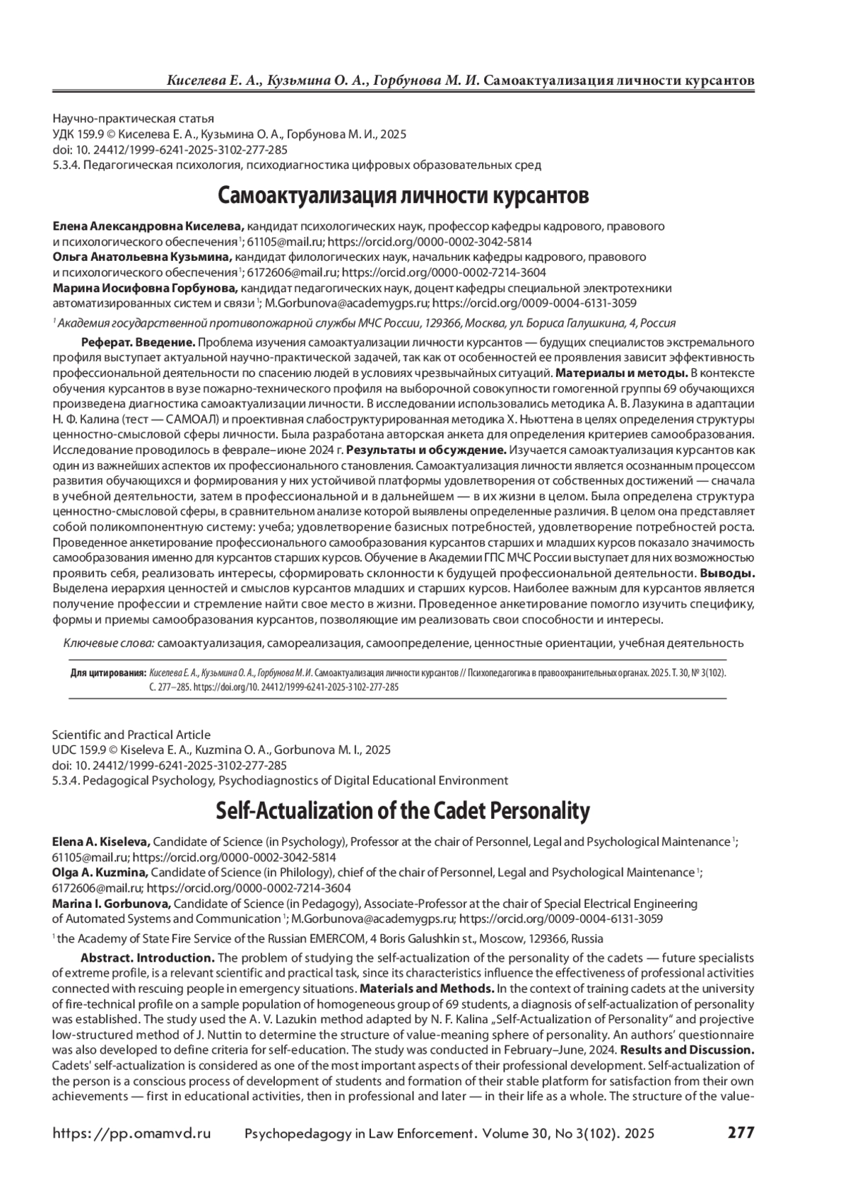 Проблема изучения самоактуализации личности курсантов — будущих специалистов экстремального профиля выступает актуальной научно-практической задачей, так как от особенностей ее проявления зависит эффективность профессиональной деятельности по спасению людей в условиях чрезвычайных ситуаций. Материалы и методы. В контексте обучения курсантов в вузе пожарно-технического профиля на выборочной совокупности гомогенной группы 69 обучающихся произведена диагностика самоактуализации личности. В исследовании использовались методика А. В. Лазукина в адаптации Н. Ф. Калина (тест — САМОАЛ) и проективная слабоструктурированная методика Х. Ньюттена в целях определения структуры ценностно-смысловой сферы личности. Была разработана авторская анкета для определения критериев самообразования. Исследование проводилось в феврале–июне 2024 г. Результаты и обсуждение. Изучается самоактуализация курсантов как один из важнейших аспектов их профессионального становления. Самоактуализация личности является осознанным процессом развития обучающихся и формирования у них устойчивой платформы удовлетворения от собственных достижений — сначала в учебной деятельности, затем в профессиональной и в дальнейшем — в их жизни в целом. Была определена структура ценностно-смысловой сферы, в сравнительном анализе которой выявлены определенные различия. В целом она представляет собой поликомпонентную систему: учеба; удовлетворение базисных потребностей, удовлетворение потребностей роста. Проведенное анкетирование профессионального самообразования курсантов старших и младших курсов показало значимость самообразования именно для курсантов старших курсов. Обучение в Академии ГПС МЧС России выступает для них возможностью проявить себя, реализовать интересы, сформировать склонности к будущей профессиональной деятельности. Выводы. Выделена иерархия ценностей и смыслов курсантов младших и старших курсов. Наиболее важным для курсантов является получение профессии и стремление найти свое место в жизни. Проведенное анкетирование помогло изучить специфику, формы и приемы самообразования курсантов, позволяющие им реализовать свои способности и интересы.