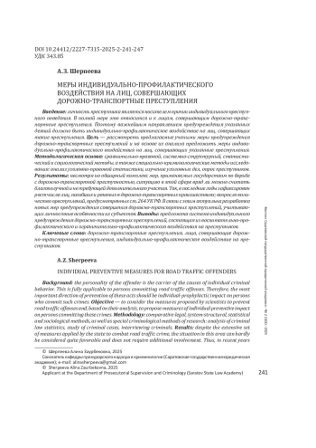 ШЕРПЕЕВА А. З. МЕРЫ ИНДИВИДУАЛЬНО-ПРОФИЛАКТИЧЕСКОГО ВОЗДЕЙСТВИЯ НА ЛИЦ, СОВЕРШАЮЩИХ ДОРОЖНО-ТРАНСПОРТНЫЕ ПРЕСТУПЛЕНИЯ // ВЕСТНИК САРАТОВСКОЙ ГОСУДАРСТВЕННОЙ ЮРИДИЧЕСКОЙ АКАДЕМИИ. 2025. № 2 (163)
