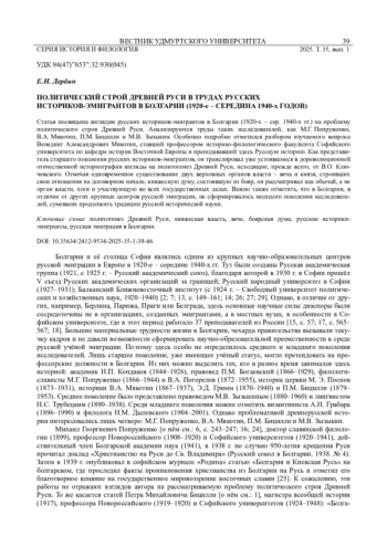Статья посвящена взглядам русских историков-эмигрантов в Болгарии (1920-х - сер. 1940-х гг.) на проблему политического строя Древней Руси. Анализируются труды таких исследователей, как М. Г. Попруженко, В. А. Мякотин, П. М. Бицилли и М. В. Зызыкин. Особенно подробно отметился разбором изучаемого вопроса Венедикт Александрович Мякотин, ставший профессором историко-филологического факультета Софийского университета по кафедре истории Восточной Европы и преподававший здесь Русскую историю. Как представитель старшего поколения русских историков-эмигрантов, он транслировал уже устоявшиеся в дореволюционной отечественной историографии взгляды на политогенез Древней Руси, исходящие, прежде всего, от В. О. Ключевского. Отмечая одновременное существование двух верховных органов власти - веча и князя, строивших свои отношения на договорном начале, княжескую думу, состоявшую из бояр, он рассматривал как обычай, а не орган власти, хотя и участвующую во всех государственных делах. Важно также отметить, что в Болгарии, в отличие от других крупных центров русской эмиграции, не сформировалось молодого поколения исследователей, сумевших продолжить традиции русской исторической науки.