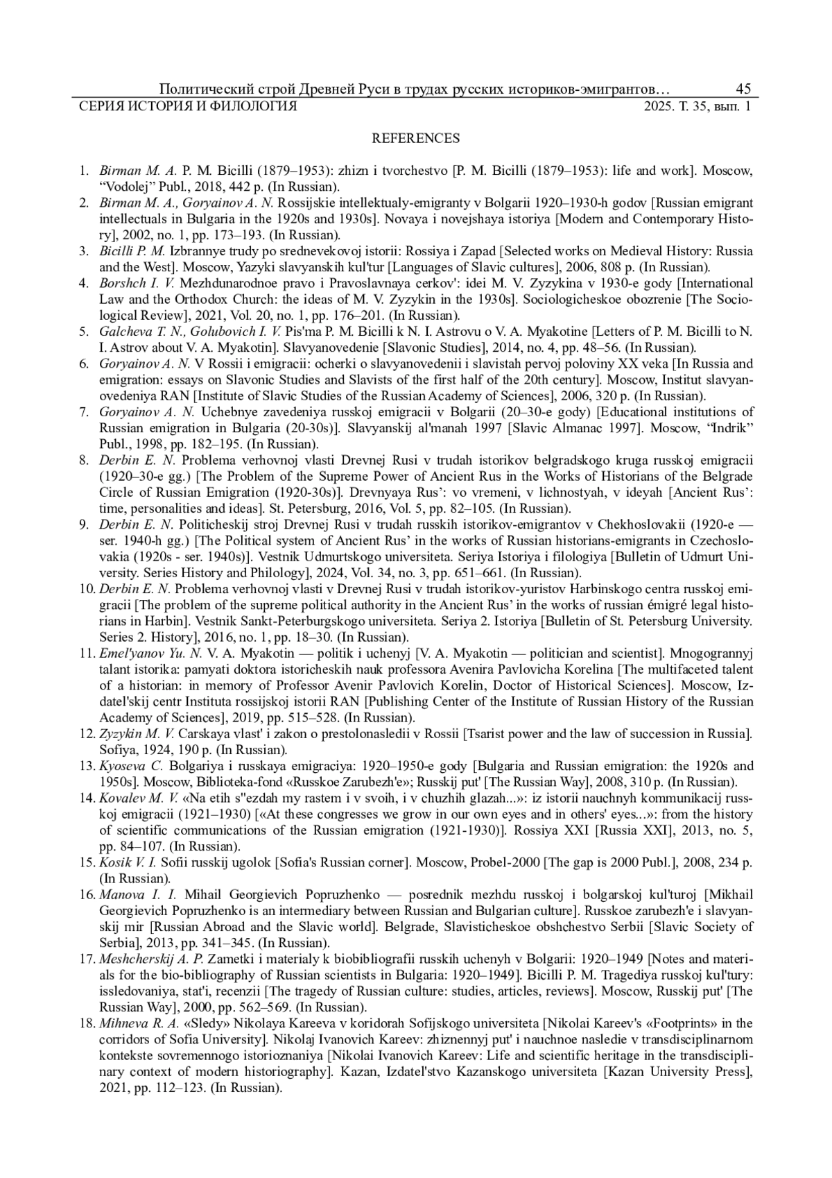 9. Дербин Е.Н. Политический строй Древней Руси в трудах русских историков-эмигрантов в Чехословакии (1920-е - середина 1940-х годов) // Вестник Удмуртского университета. Серия История и филология. 2024. Т. 34. № 3. С. 651-661. EDN: DVULBG
