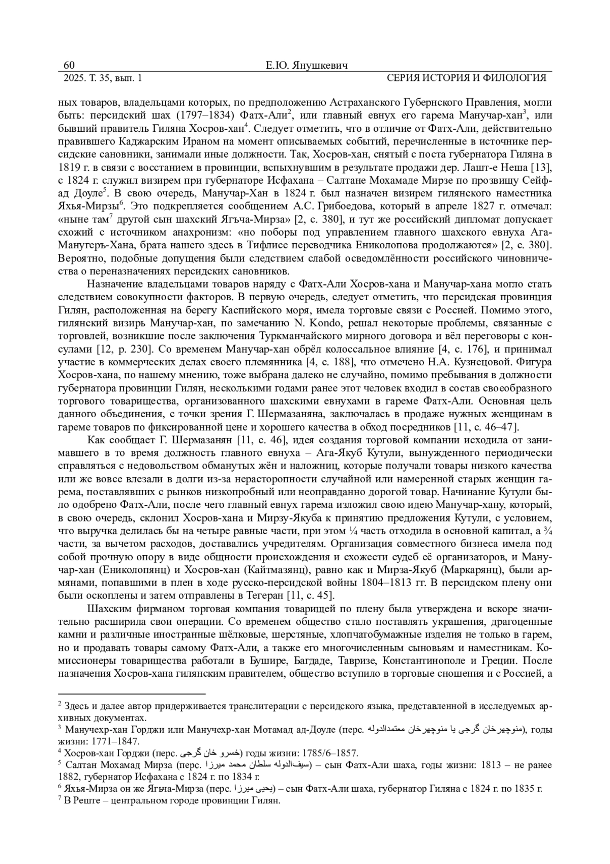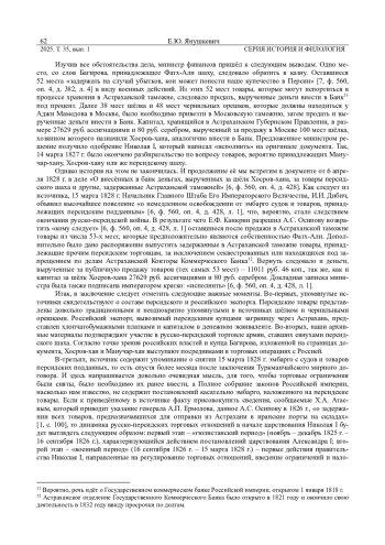 В статье исследуется комплекс делопроизводственных источников из фонда Общей канцелярии министра финансов, хранящегося в Российском государственном историческом архиве (РГИА). Анализируемые документы, насколько нам известно, ранее не являлись предметом изучения. Рассматриваемые источники повествуют о состоянии русско-персидской торговли во время русско-персидской войны 1826-1828 гг. и спустя немногим более, чем месяц после её окончания. В результате проведённого исследования были установлены все лица, упомянутые в документах и прямо или косвенно причастные к экономическому диалогу между Россией и Персией. Получены сведения об участии в торговле между двумя государствами шахских евнухов Хосров-хана и Манучар-хана, имевших армянское происхождение. Кроме того, предложена периодизация динамики развития торговых отношений с Персией от воцарения Николая I до вступления в силу положений Туркманчайского мирного трактата. Статья также касается вопроса введения в годы русско-персидской войны эмбарго, наложившего ограничения на персидское купечество.