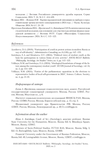 4. Ирсетская, Китайцева 2024 - Ирсетская Е.А., Китайцева О.В. Политические взгляды студенческой молодежи, как основание для участия в различных формах гражданской активности // Вестник РГГУ. Серия «Философия. Социология. Искусствоведение». 2024. № 4. С. 115-125.