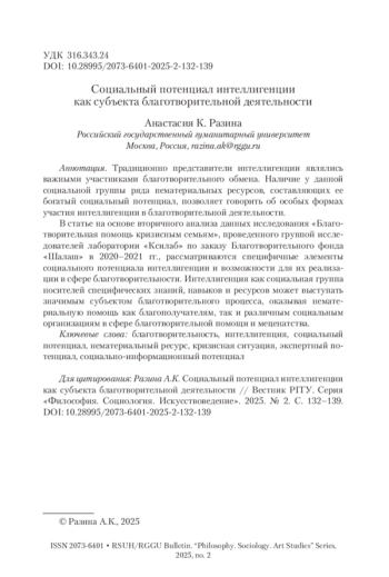 Традиционно представители интеллигенции являлись важными участниками благотворительного обмена. Наличие у данной социальной группы ряда нематериальных ресурсов, составляющих ее богатый социальный потенциал, позволяет говорить об особых формах участия интеллигенции в благотворительной деятельности. В статье на основе вторичного анализа данных исследования «Благотворительная помощь кризисным семьям», проведенного группой исследователей лаборатории «Ксилаб» по заказу Благотворительного фонда «Шалаш» в 2020–2021 гг., рассматриваются специфичные элементы социального потенциала интеллигенции и возможности для их реализации в сфере благотворительности. Интеллигенция как социальная группа носителей специфических знаний, навыков и ресурсов может выступать значимым субъектом благотворительного процесса, оказывая нематериальную помощь как благополучателям, так и различным социальным организациям в сфере благотворительной помощи и меценатства.