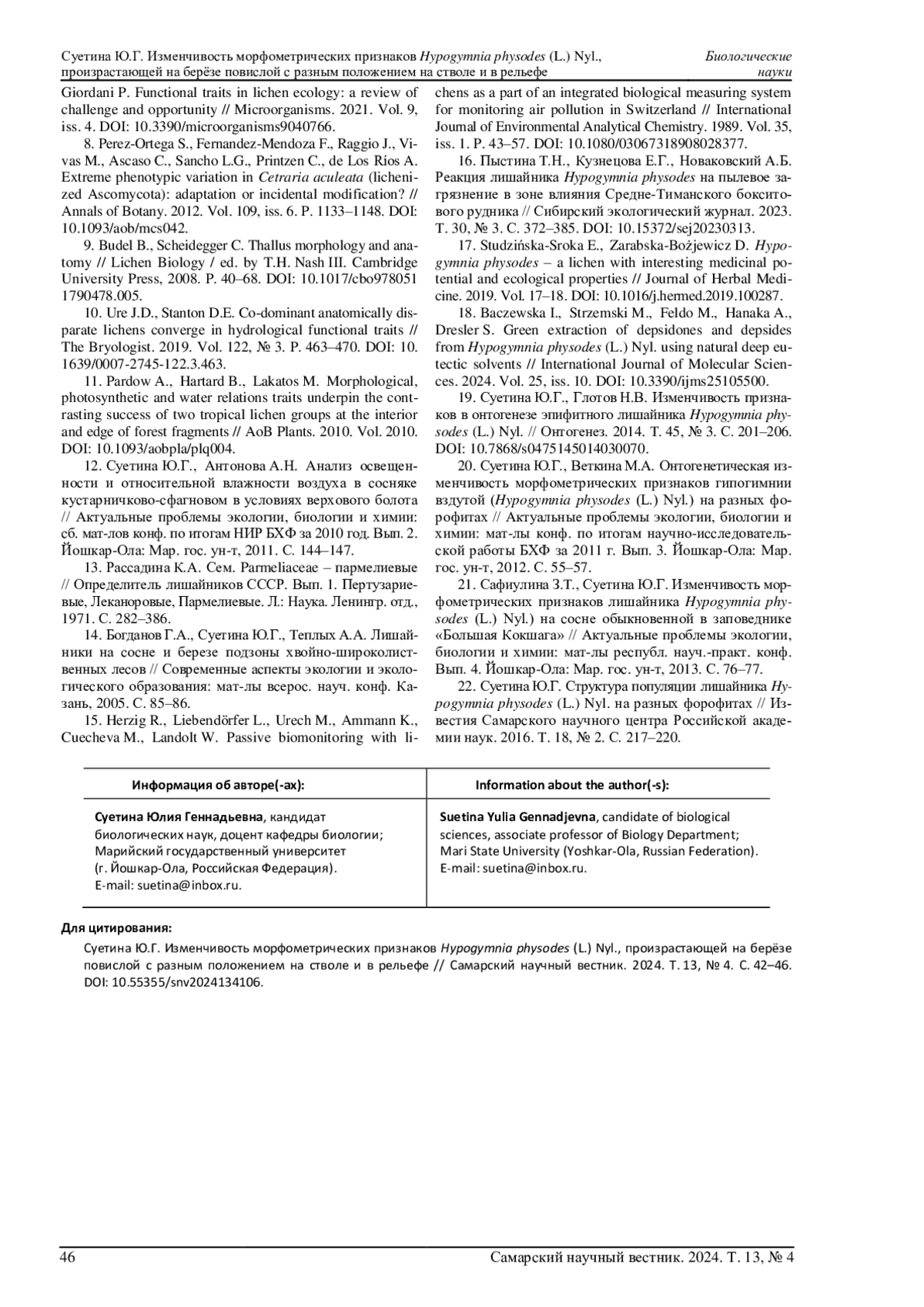 19. Суетина Ю.Г., Глотов Н.В. Изменчивость признаков в онтогенезе эпифитного лишайника Hypogymnia physodes (L.) Nyl. // Онтогенез. 2014. Т. 45, № 3. С. 201-206. DOI: 10.7868/s0475145014030070 EDN: SCEDHF